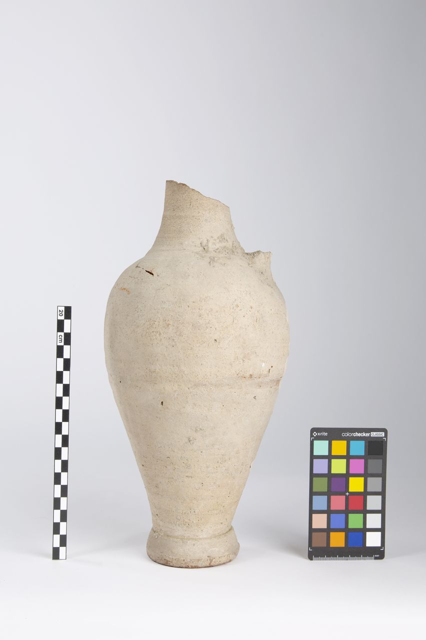 collo leggermente troncoconico, spalla arrotondata, distinta dal collo da una lieve risega. Alto piede ad anello a margine obliquo. Attacco di un'ansa verticale, tricostolata, impostata sulla spalla.Per caratteristiche fisiche e tecniche, per diffusione nel bacino del Mediterraneo e per essere in gran parte fornite di indicazioni sul contenuto pongono problemi di classificazione all’interno della ceramica da mensa e dispensa e rientrano in quel gruppo di materiali al confine tra le anfore e la ceramica comune (Gasperetti, 1996). Tra la tarda età repubblicana e la prima età imperiale è spesso classificato sotto la definizione di urceo e risulta diffuso in tutto il mondo romano, con una certa varietà nella resa dell’orlo e nelle proporzioni tettoniche.Profonde profonde linee di tornio esterne,Ingobbiatura chiara