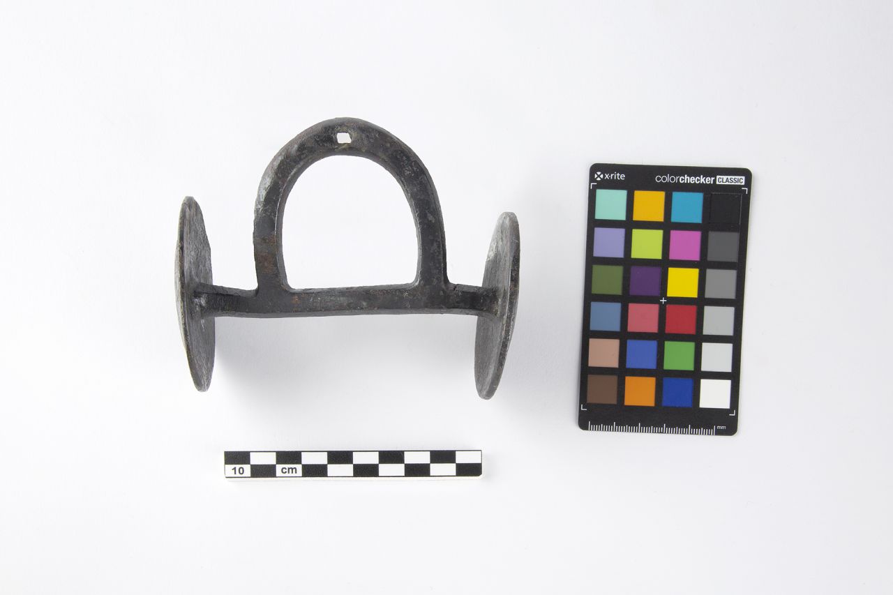 - NOTIZIE STORICO CRITICHE Ann Hyland divide le imboccature equine in filetti e morsi: i primi usati per la quotidianità e per i viaggi, a cannone unico o in due o tre pezzi, generalmente più miti, poiché, facendo una costante pressione sulle barre del cavallo, lo rendevano a lungo andare quasi insensibile, i secondi, più elaborati e complessi, impiegati in ambito militare (A. Hyland, The horse in the Middle Ages, Sutton Publishing, Phoenix Mill, 1999, p. 65). Nella tradizione di studi che riguarda questi oggetti, vengono ritrovati più morsi semplici rispetto a quelli complessi, che sono invece molto più frequenti nelle testimonianze artistiche: ciò probabilmente è dovuto al fatto che la mentalità antica vedeva nella bardatura più appariscente un simbolo di grandezza e potere, ma che le imboccature realmente utilizzate erano più dolci, simili alle odierne, perché rendevano i cavalli più facilmente controllabili e gestibili (J. Clark, The medieval horse and its equipment. Medieval finds from excavations in London. 1150- 1450, Museum of London, Londra, 1995, p. 46). Il reperto in esame appartiene dunque alla prima categoria che prevede un innesto di materiale deperibile, forse cuoio, per rendere l'imboccatura più gestibile, il cui unico indizio è il forellino di aggancio sul ponte a U (e su cui, cfr. anche C. Giannelli, Equus frenatus, Brescia, 2015, p. 152)