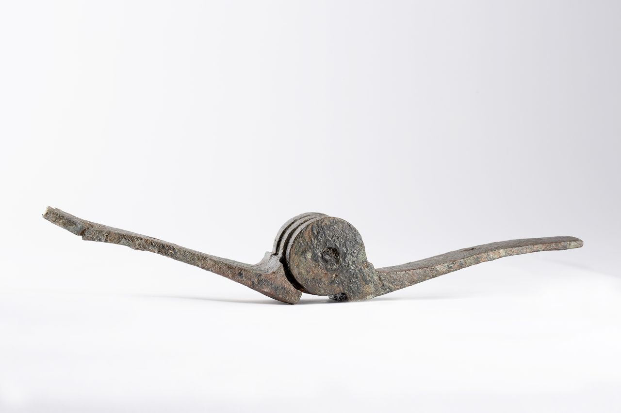 Cardine a forma di placca trapezoidale a margine interno ripiegato ad L, cerniera a cinque larghi anelli cilindrici che conservano ancora tracce del tubolare in ferro. Le placche hanno lati tre lati profilati e due larghi fori per chiodi di innesto