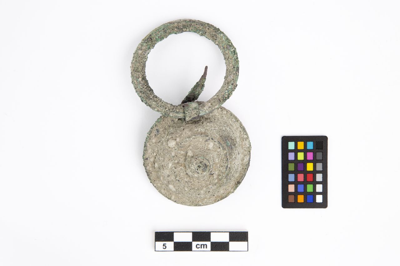Borchia circolare con anello di presa a doppia punta; orlo con estremità leggermente rialzata, lungo la quale si trova un foro per la copiglia di fissaggio, a molla, calotta sagomata con terminazione a globetto