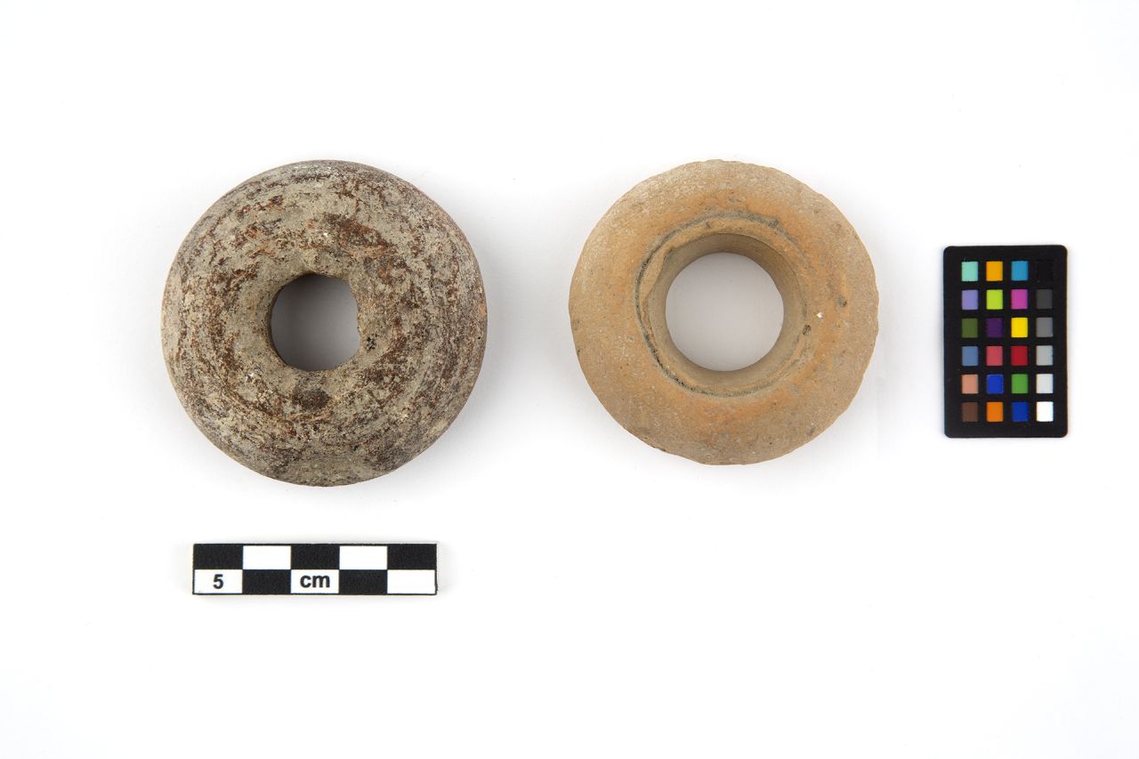 Due distanziatori fittili da fornace ad anello. A: Distanziatore di forma circolare con foro passante interno, dalla superficie piano-convessa e sezione sub-circolare. Argilla di colore arancio-rosato.B: Distanziatore di forma circolare con ampio foro passante interno, dalla superficie piano-convessa e sezione sub-circolare. Argilla arancio-beige
