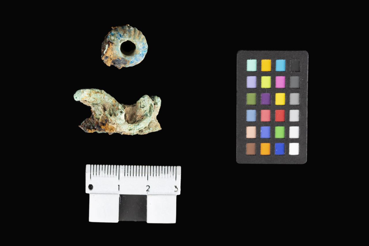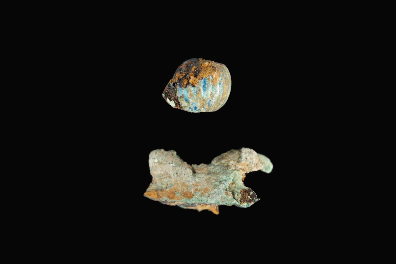 Vago di forma sferoidale in pasta vitrea di colore blu. Un ampio foro lo attraversa longitudinalmente. Il vago era adeso ad una catenella e ad una barretta rettangolare di bronzo