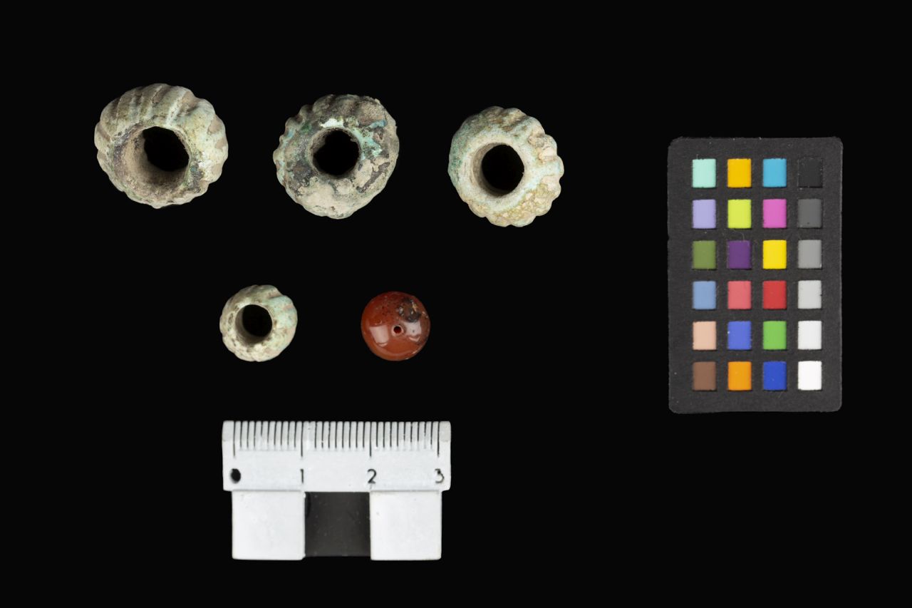N. 4 vaghi sferoidali in pasta vitrea turchese, di forma sferoidale con ampio foro passante in senso longitudinale e un vago in corniola arancione, con piccolo foro passante. Si individuano quattro gruppi, per dimensione decrescente. Gruppo A: due vaghi sferoidali in pasta vitrea; B: un vago sferoidale in pasta vitrea; C: un vago sferoidale in pasta vitrea; D: un vago sferoidale in corniola