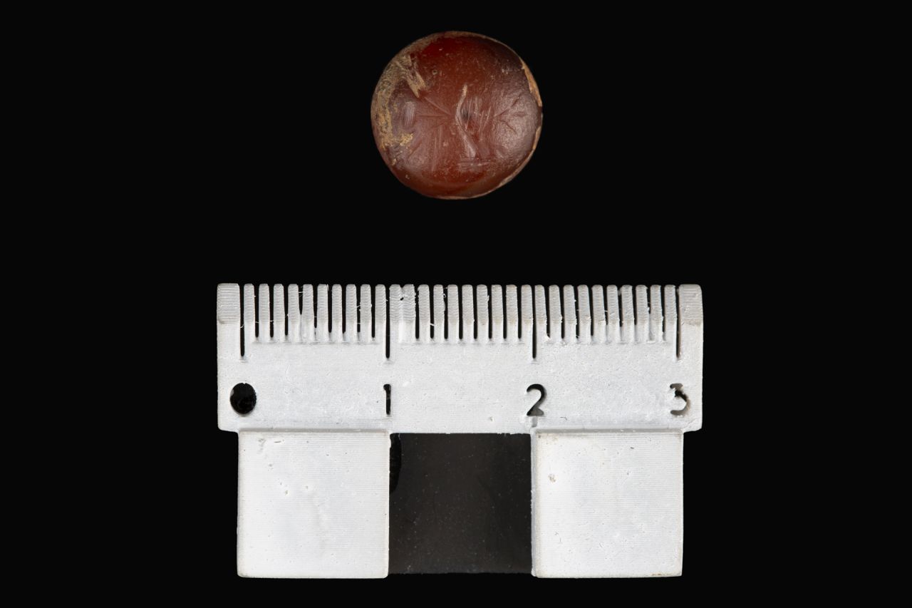 Gemma in corniola arancione di forma circolare con recto inciso convesso e verso piatto