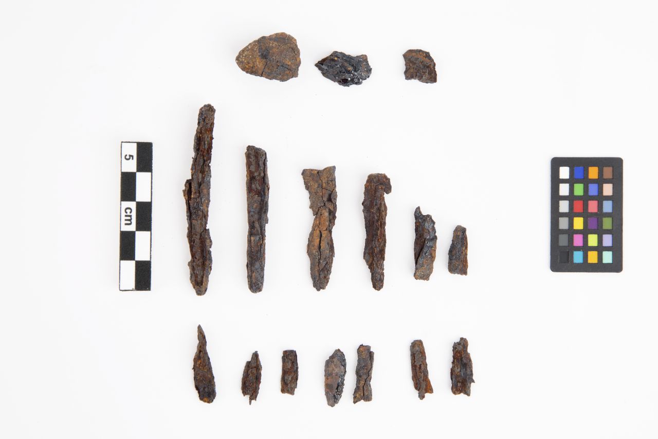 N.13 frammenti di chiodi in ferro privi della testa con gambo a sezione quadrangolare, rastremato verso la punta e N. 3 frammenti di chiodi in ferro privi del gambo, con testa a sezione circolare a sezione piana