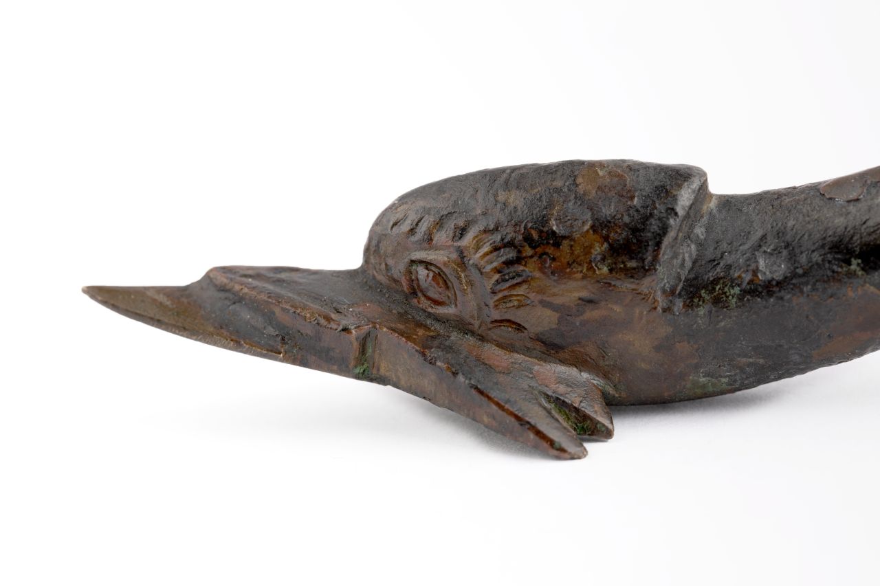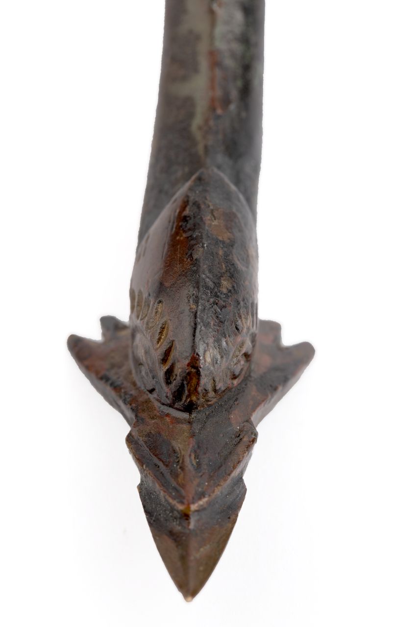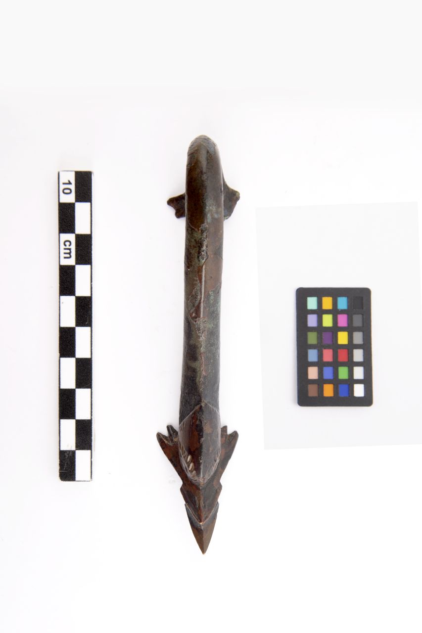 Ansa di brocca in bronzo a bastoncello, del tipo ad orecchio. Il fusto liscio con costolatura mediana presenta un attacco inferiore desinente a testa di delfino