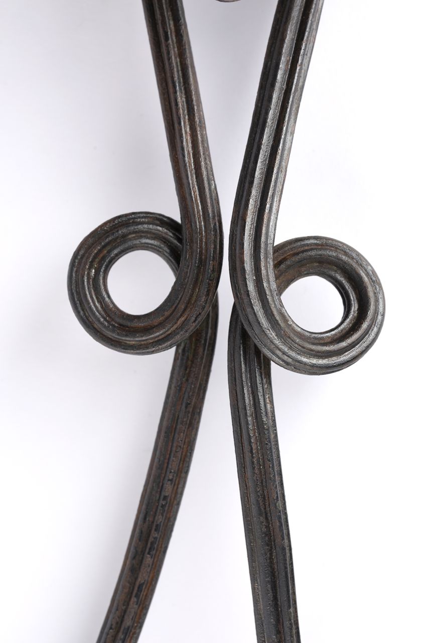 Elemento in bronzo costituito da due verghe a sezione circolare scanalate, forgiate nell'estremità superiore a formare nodi ed altri motivi ricurvi. Nodi si riconoscono anche nella parte centrale e inferiore delle due verghe, dove presentano terminazioni appuntite