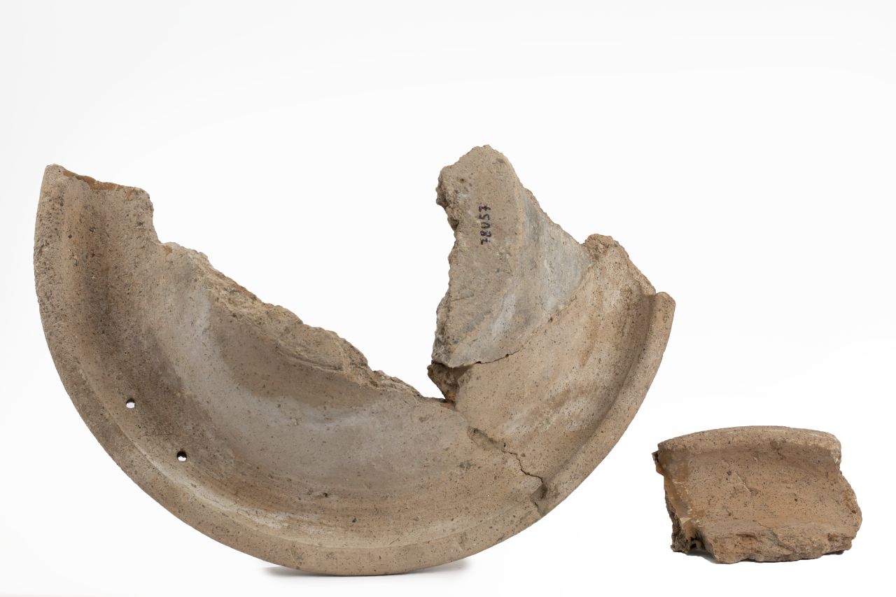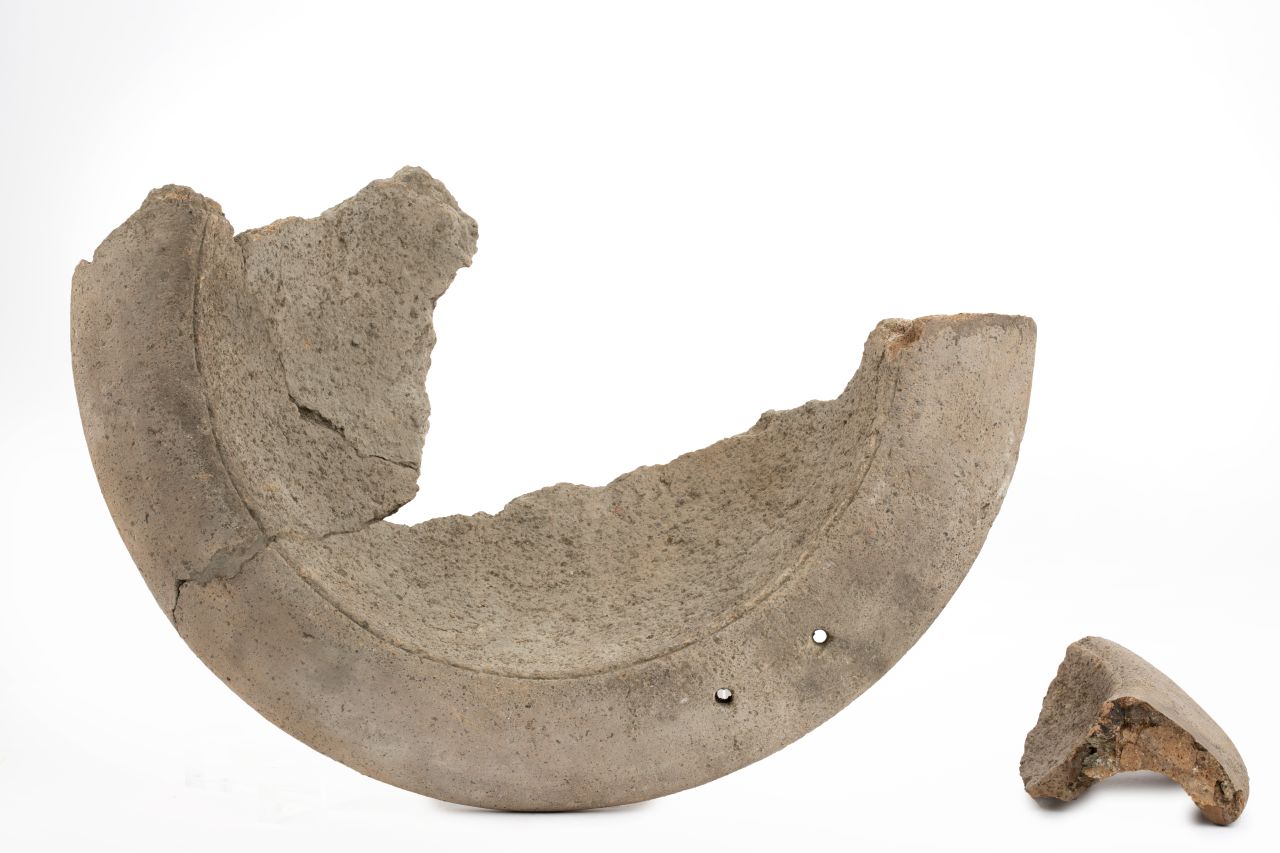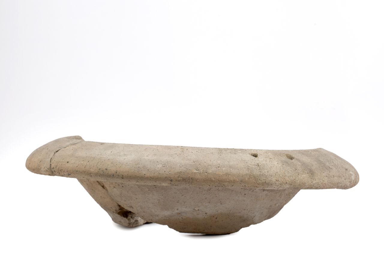 - NOTIZIE STORICO CRITICHE La massiccia produzione dei mortaria del tipo Dramont D2 moltiplica anche la pratica della bollatura, il testo e quasi sempre disposto su due righe, nessi e abbreviazioni divengono molto frequenti. E altresì piuttosto comune imbattersi in svariate tipologie di elementi figurati che fungono da segni di interpunzione o, con dimensioni maggiori, separano i due registri di scrittura o completano il campo del cartiglio rimasto libero. Su questi prodotti i bolli sono generalmente impressi ai lati del versatoio, perpendicolari alla circonferenza della vasca. E'possibile trovare un solo bollo su uno dei due lati oppure la medesima impressione sia a destra che a sinistra del beccuccio di versamento; talvolta, come in questo caso, sull’orlo, in posizione opposta al versatoio, compaiono uno o più fori funzionali a riporre l’oggetto. La parte conservata di questo esemplare è quella priva del bollo