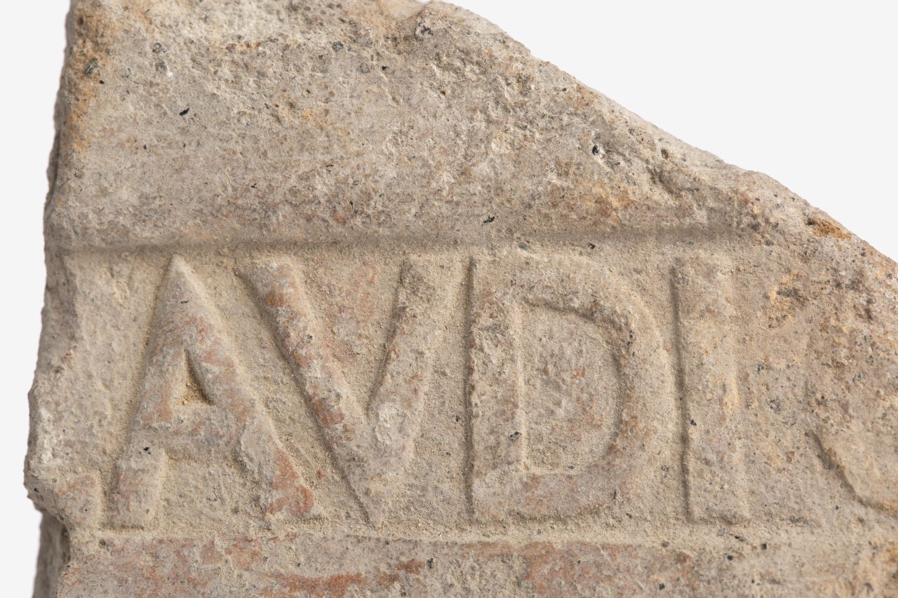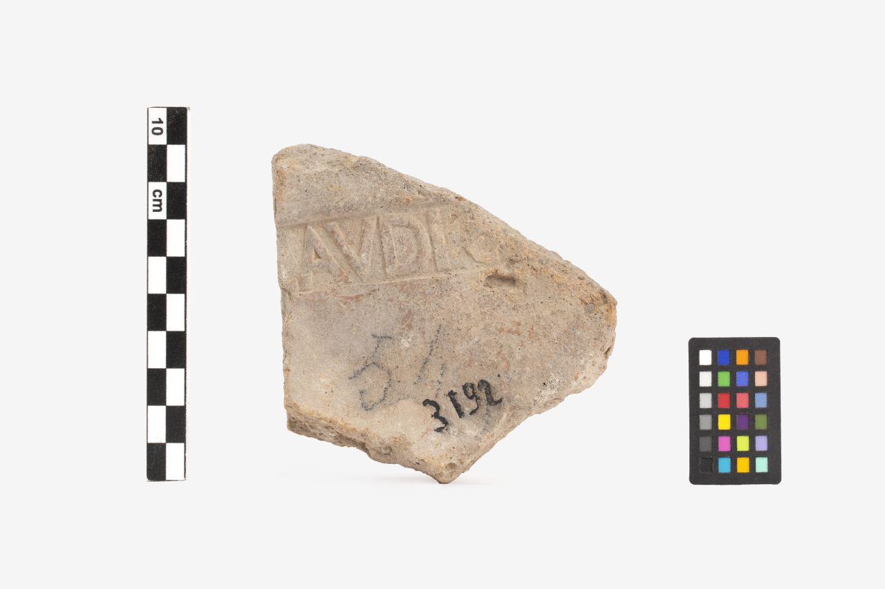 un frammento della parte piana con attacco dell'aletta, liscia, con marchio di fabbrica impresso in cartiglio rettangolare