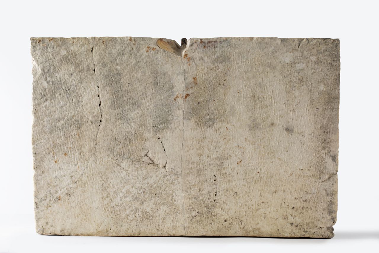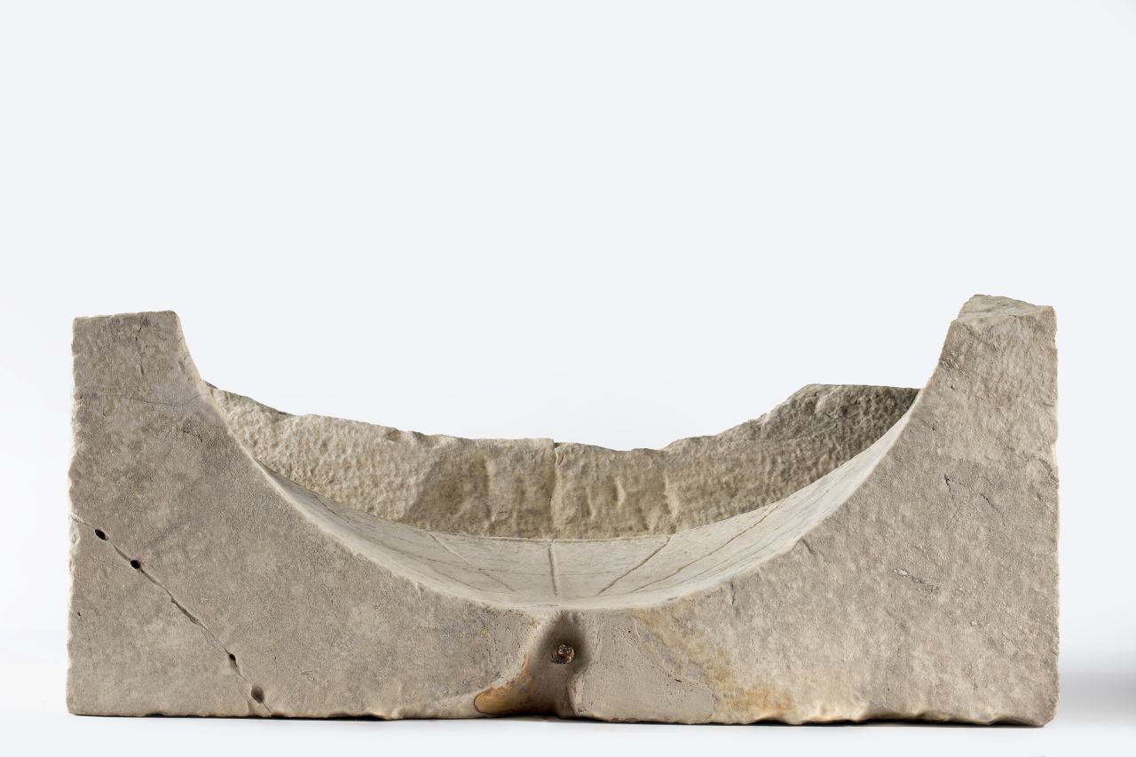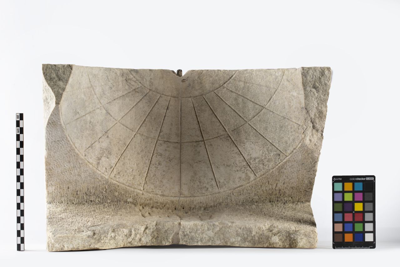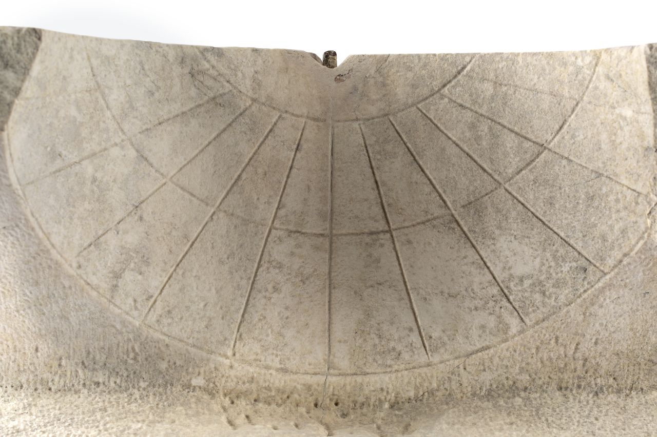 Meridiana scolpita in un unico blocco di marmo bianco. E' costituita da una forma più o meno parallelepipeda nella quale è inserita una semisfera (il quadrante), sporgente rispetto alla base, con le linee orarie incise. Alla sommità dell'emisfera era posta una sottile asta di bronzo (lo gnomone), ora perduta, che fuoriusciva dal foro mediano superiore e proiettava l'ombra indicando le ore