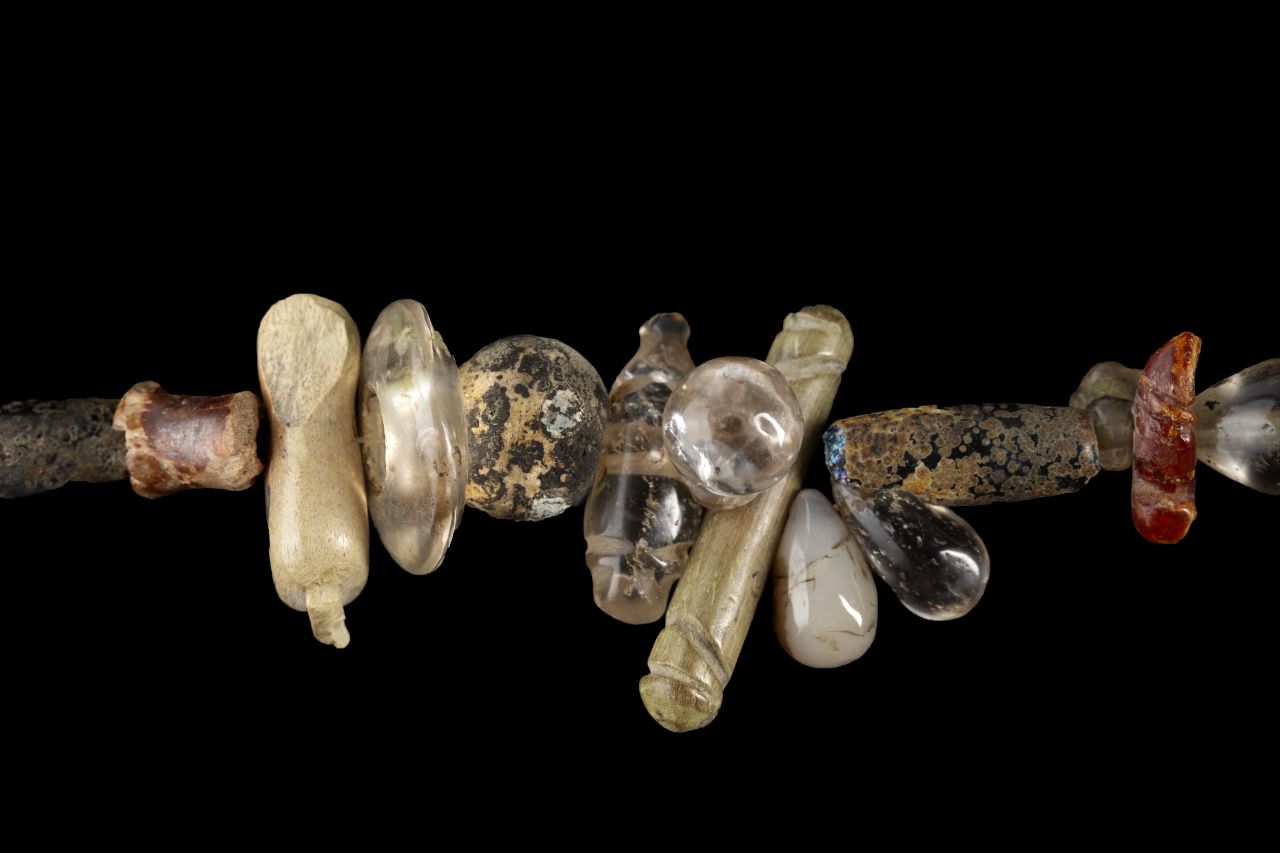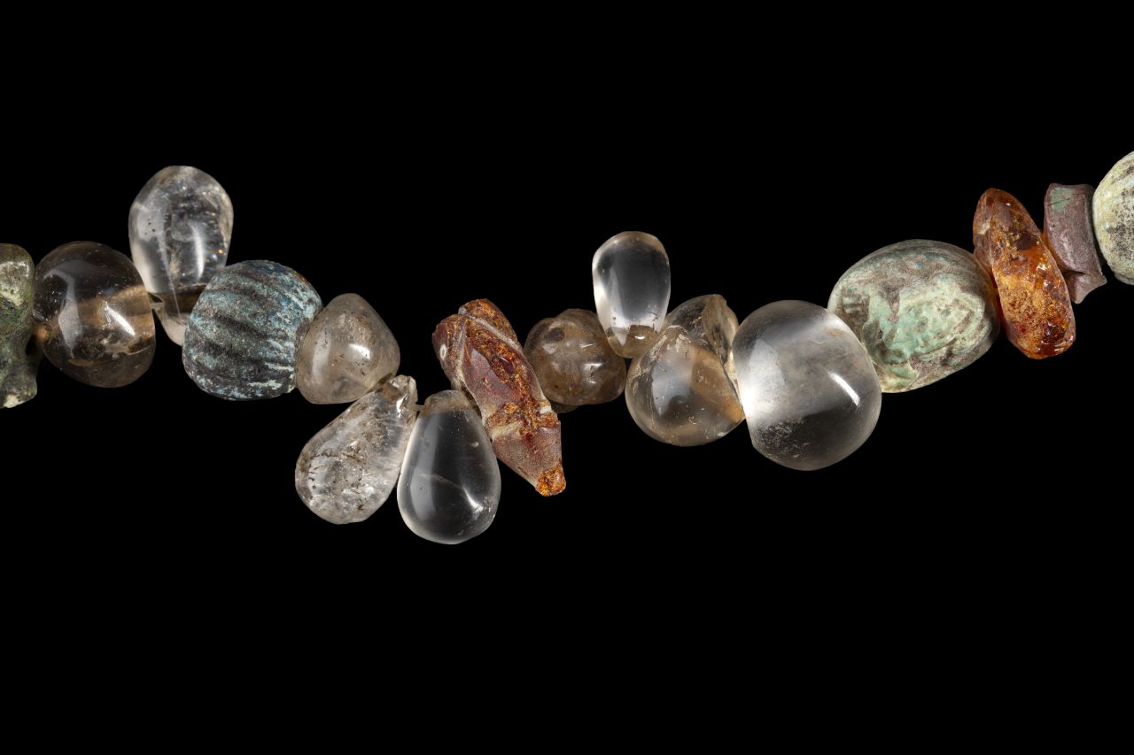 Novantotto vaghi e pendenti appartenenti ad una collana: sessanta in cristallo di rocca di cui 6 a forma di anforetta, 25 di forma sferoidale di diverse dimensioni, 13 dalla forma a goccia, 2 di forma pressochè cilindrica, 9 di forma troncoconica, 3 di forma lenticolare 1 a forma di scarabeo; 10 vaghi in pasta vitrea, di cui 8 del tipo sferoidale costolato di colore turchese e 2 a sezione piatta di colore marrone; 7 pendenti in pasta vitrea di colore turchese conformati a rana, mano, pube, arula, pigna, bue; 7 pendenti in osso intagliato, di cui uno a forma di otto, 1 discoidale, 1 raffigurante una mano, 1 a forma di animale, 1 falliforme, 1 a forma di rocchetto, 1 planta pedis; 6 pendenti di ambra rossa dei quali uno dalla forma indeterminata, 1 astragalo, 1 fallo, 1 ranocchio, 1 vagamente discoidale, 1 pigna; 7 vaghi in vetro di cui 1 piriforme di colore giallo, 3 cilindrici di colore blu