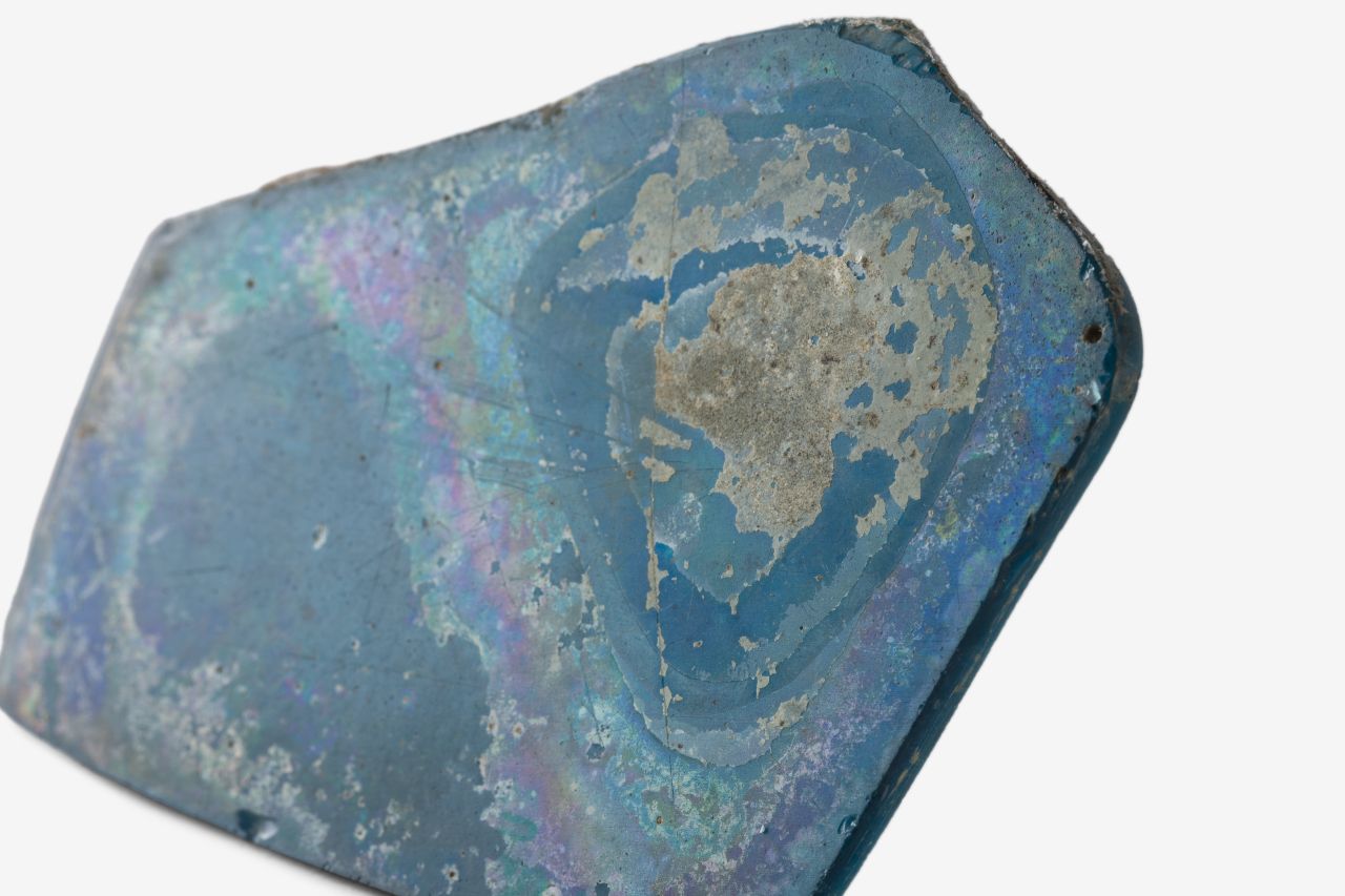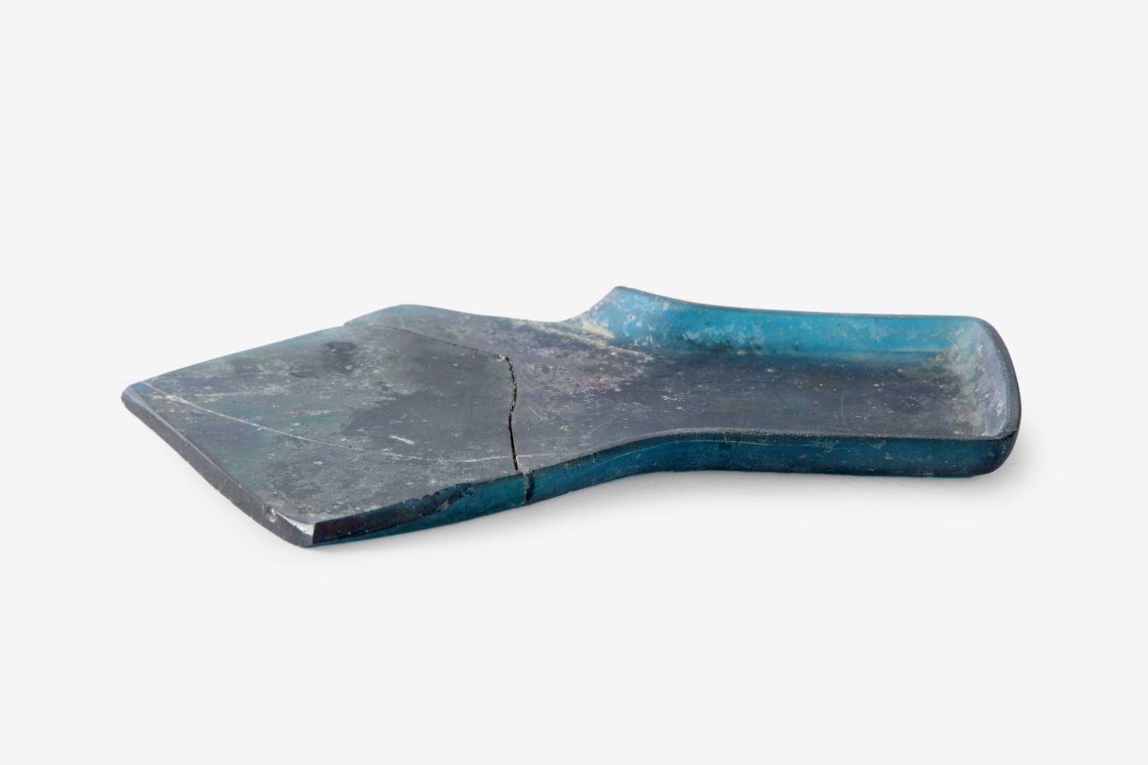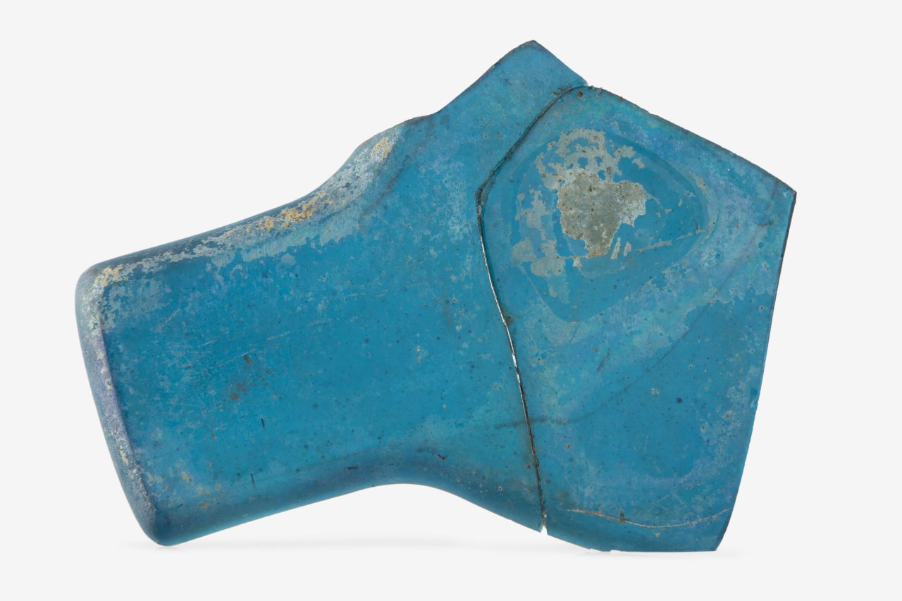Frammento di vassoio con manico di forma rettangolare. Vetro trasparente di colore blu