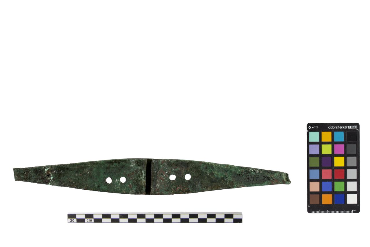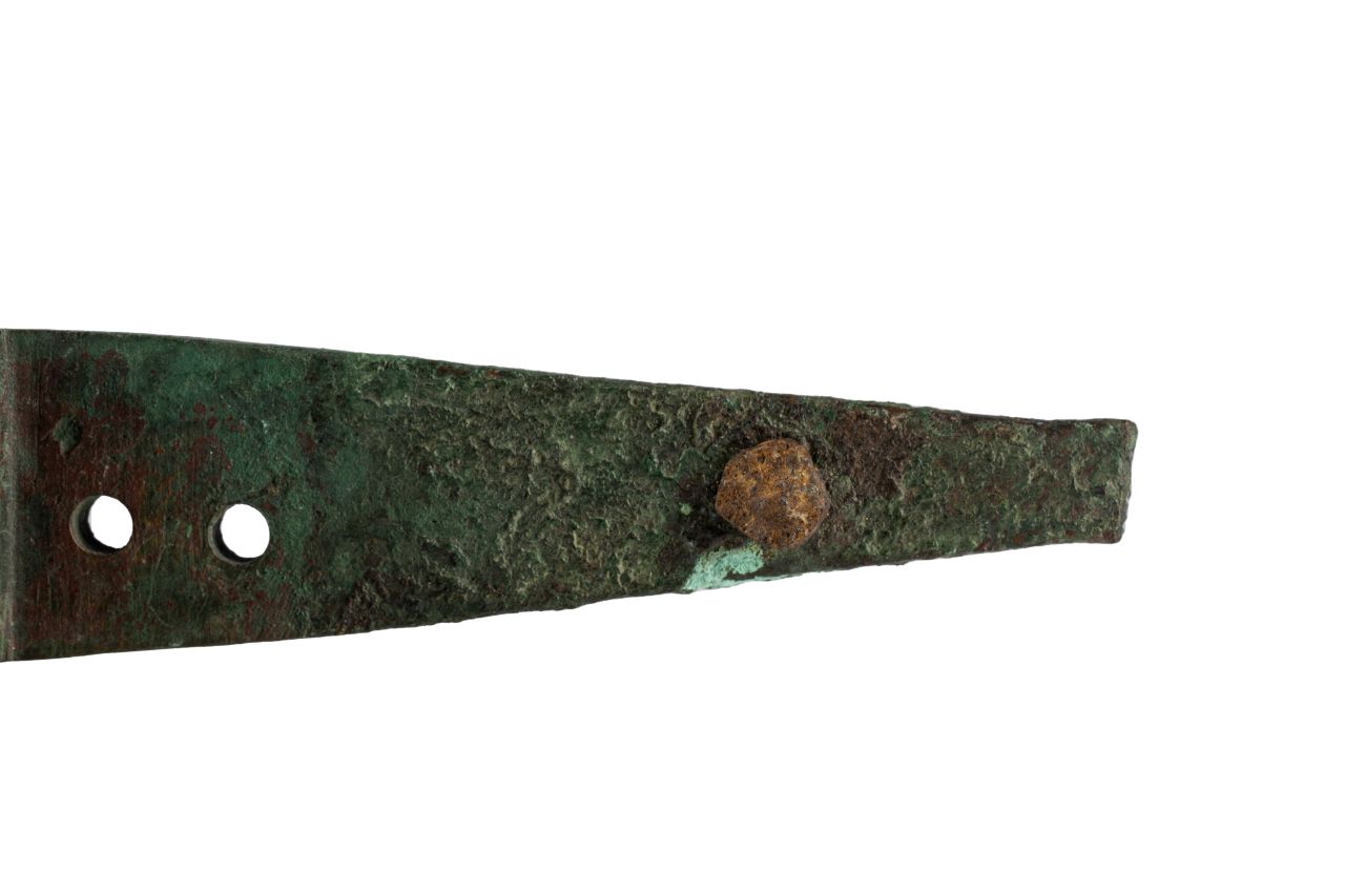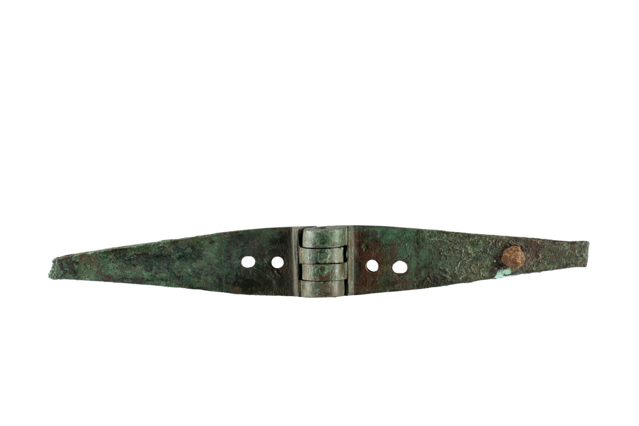 Cardine a forma di placca trapezoidale con margine interno ripiegato ad L; cerniera aquattro anelli cilindrici che conservano ancora tracce del perno in ferro. Sulle placche sono presenti due larghi fori per chiodi di innesto, non conservati