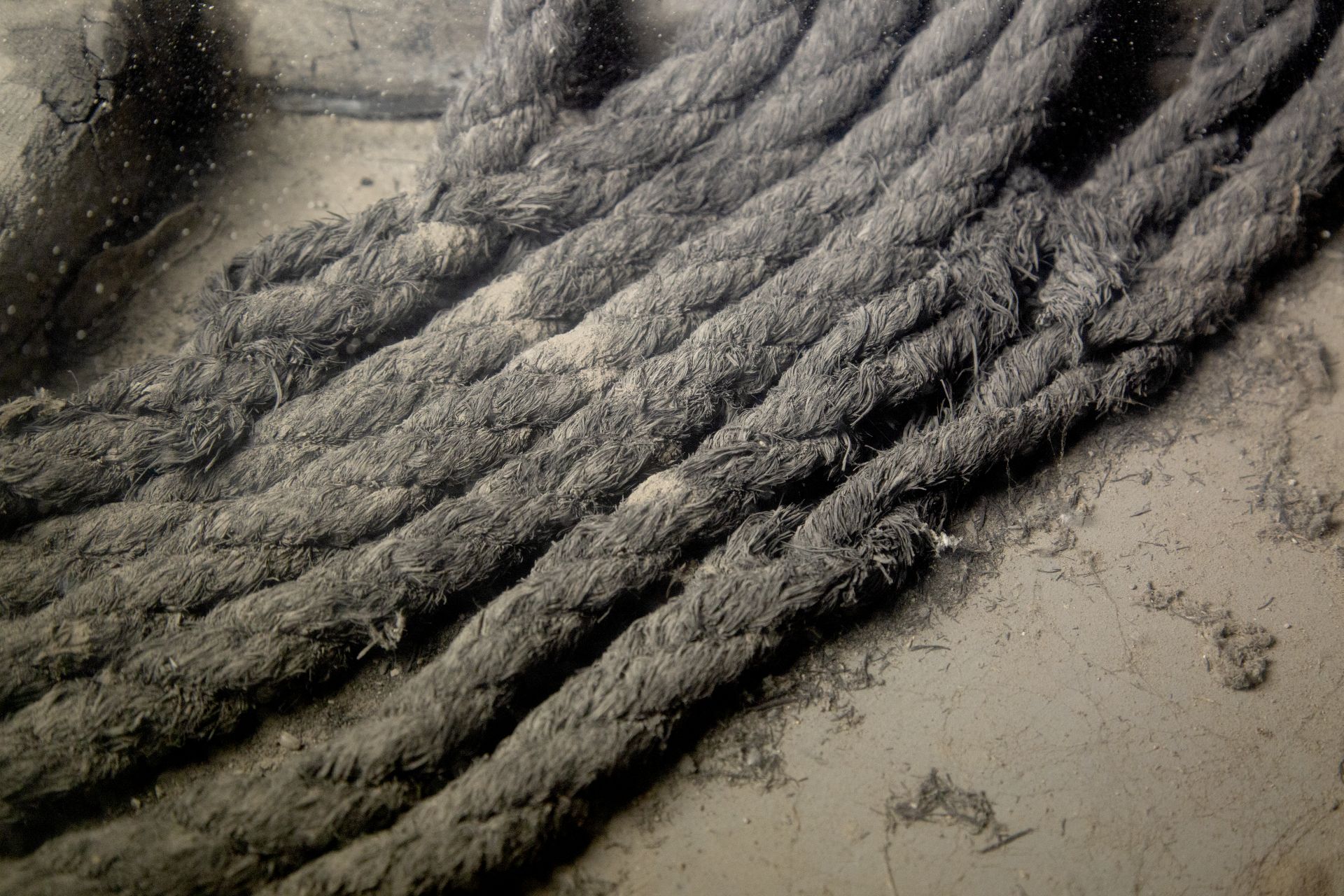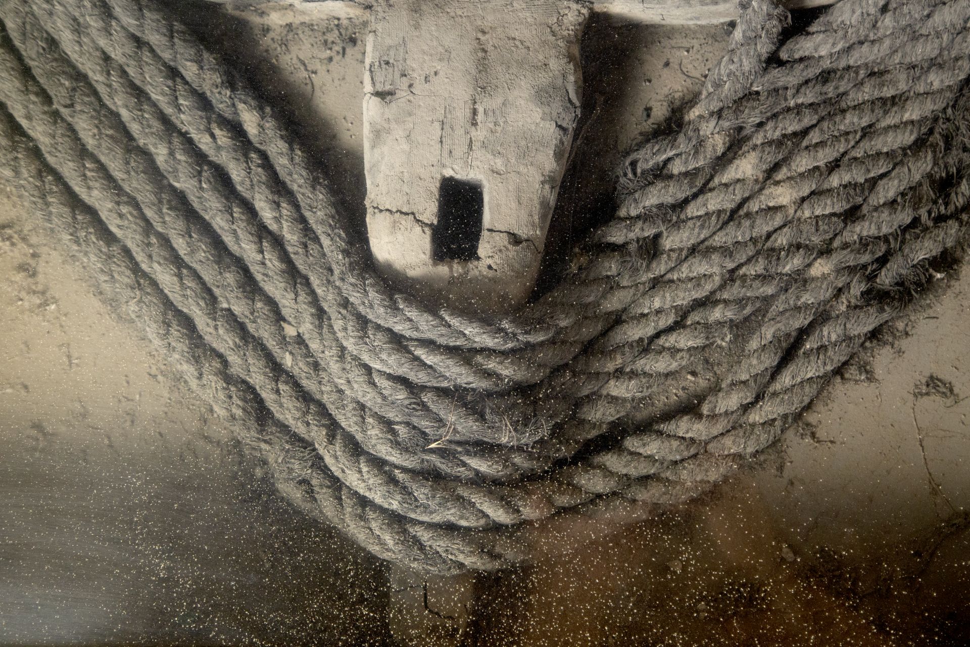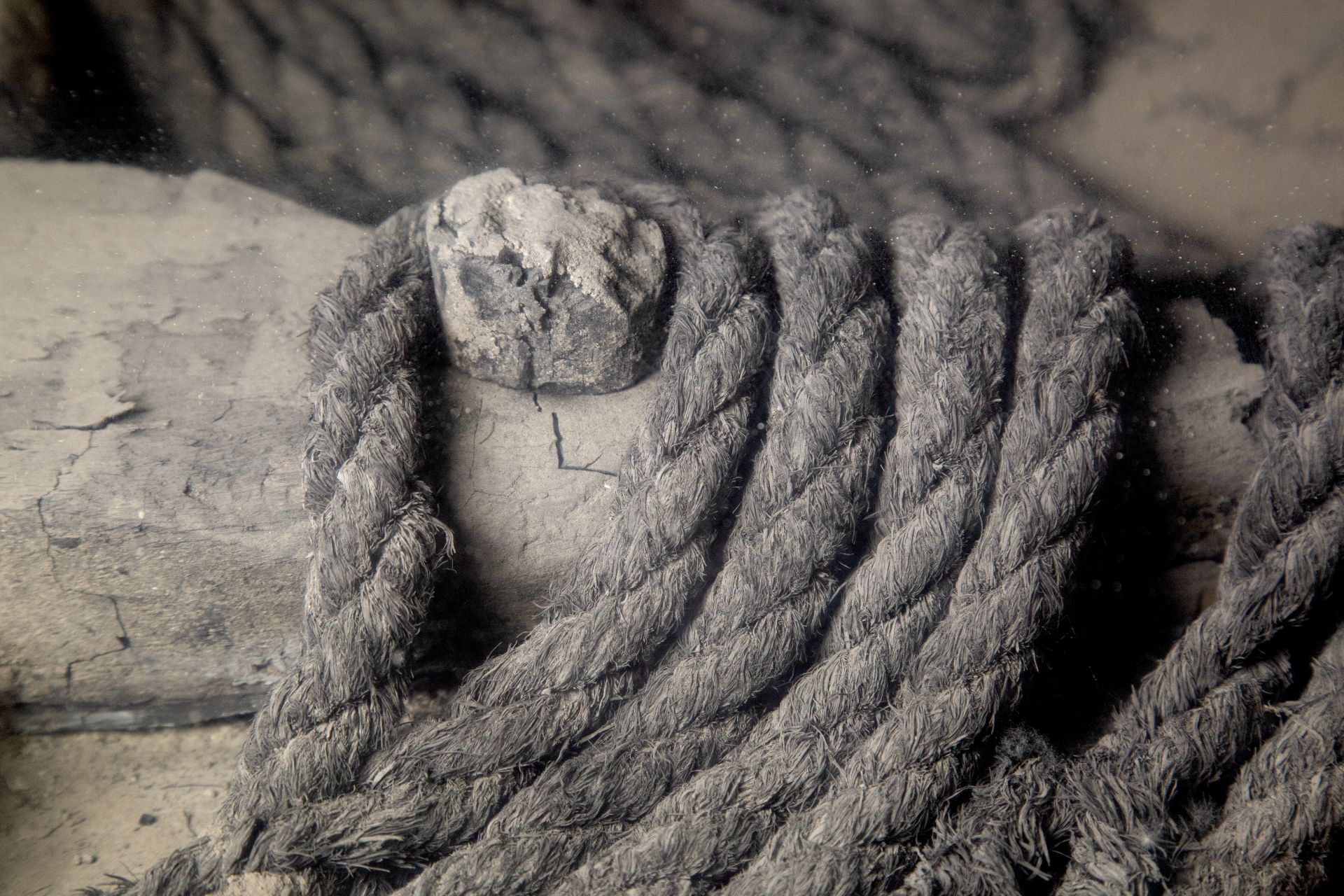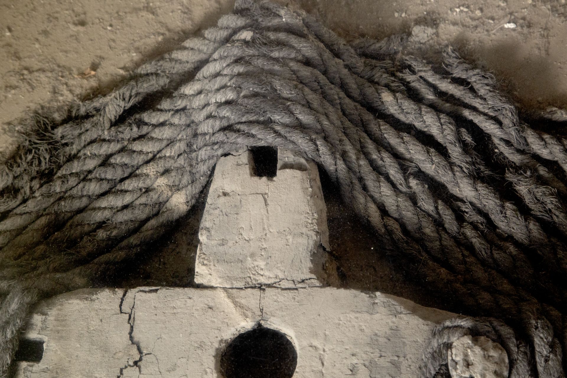 Resti di argano in legno con corpo a forma di croce con foro centrale. Alle estremità è arrotolata una corda