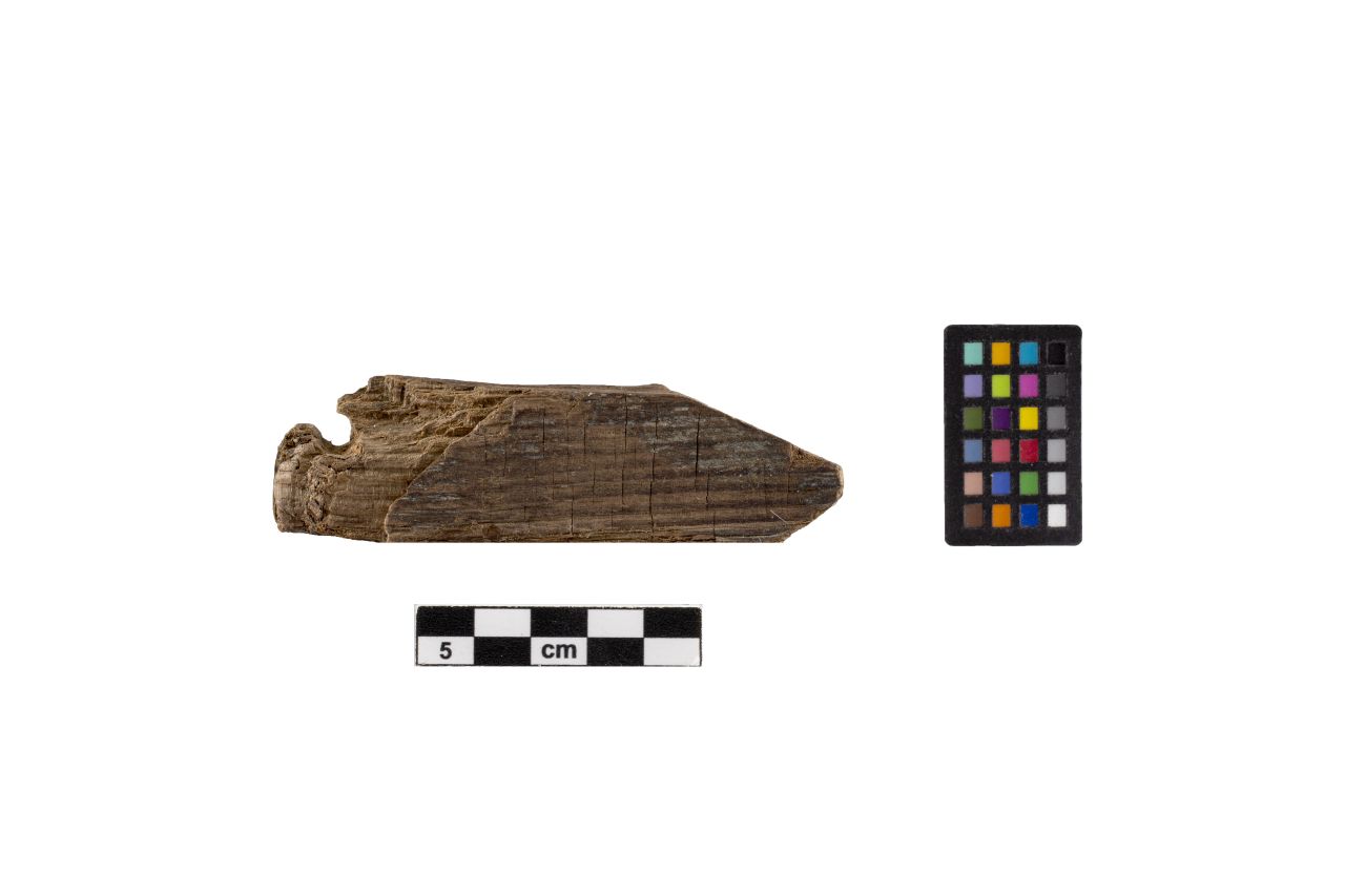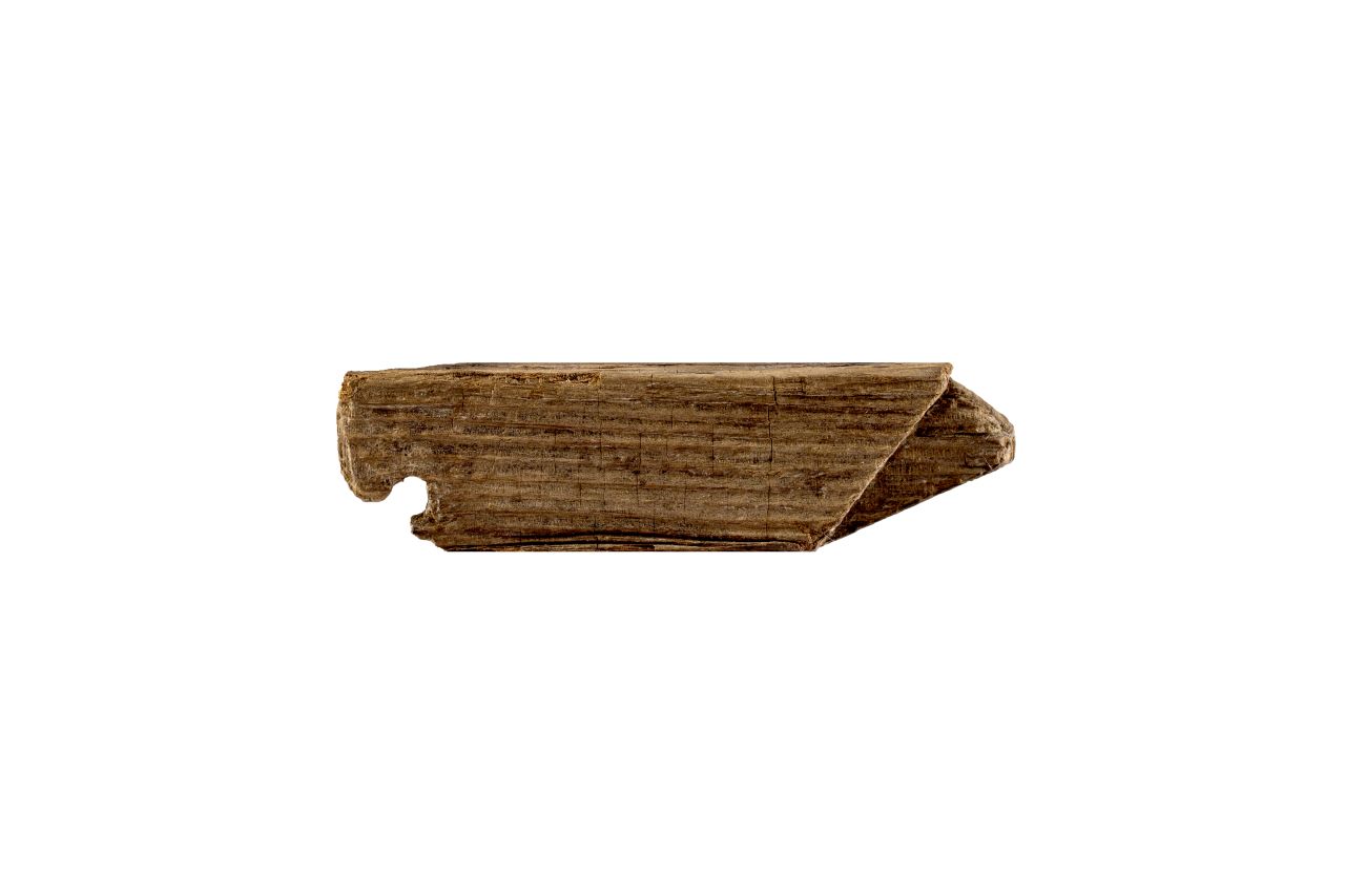 - NOTIZIE STORICO CRITICHE Il listello probabilmente poteva essere uno degli elementi ad aggetto che componeva la decorazione geometrica del pannello di uno dei quattro dei grandi lacunari compositi del controsoffitto. Il listello è dotato di incastri “a tenone” e sagomato proprio per ancorarsi agli altri listelli della decorazione. Questi elementi nonostante le dimensioni ridotte sono l’esempio dell’alto livello di specializzazione raggiunto dalle maestranze specializzate, ovvero gli artigiani del legno. Le maestranze addette si distinguevano in almeno due grandi categorie i lignarii, che si occupavano della scelta e l’abbattimento dell’albero, dell’essiccatura dei legni, della scortecciatura e del trasporto/commercio mentre i fabrii, simili ai moderni falegnami, lavoravano e assemblavano le parti lignei. I fabrii mediante strumenti di precisione, usati anche oggi, ad esempio il cesello rifinivano ad arte piccoli listelli di legno. Le sagomature erano di fondamentale importanza, eseguite per raccordare gli elementi tra loro che poi venivano fissati ad esempio sui manufatti compositi, come i grandi lacunari. Le sagomature sono visibili sui listelli (tasselli) decorativi e sulle cornici perimetrali