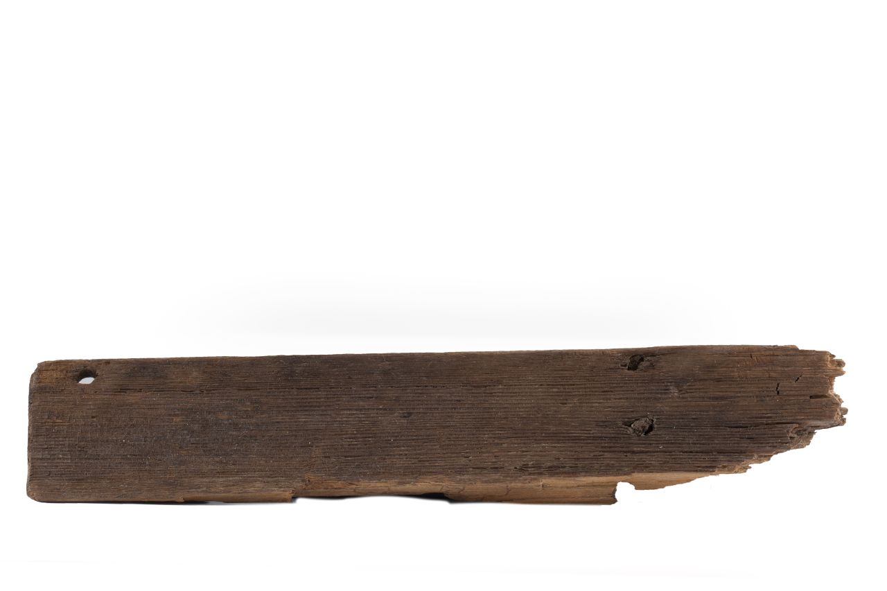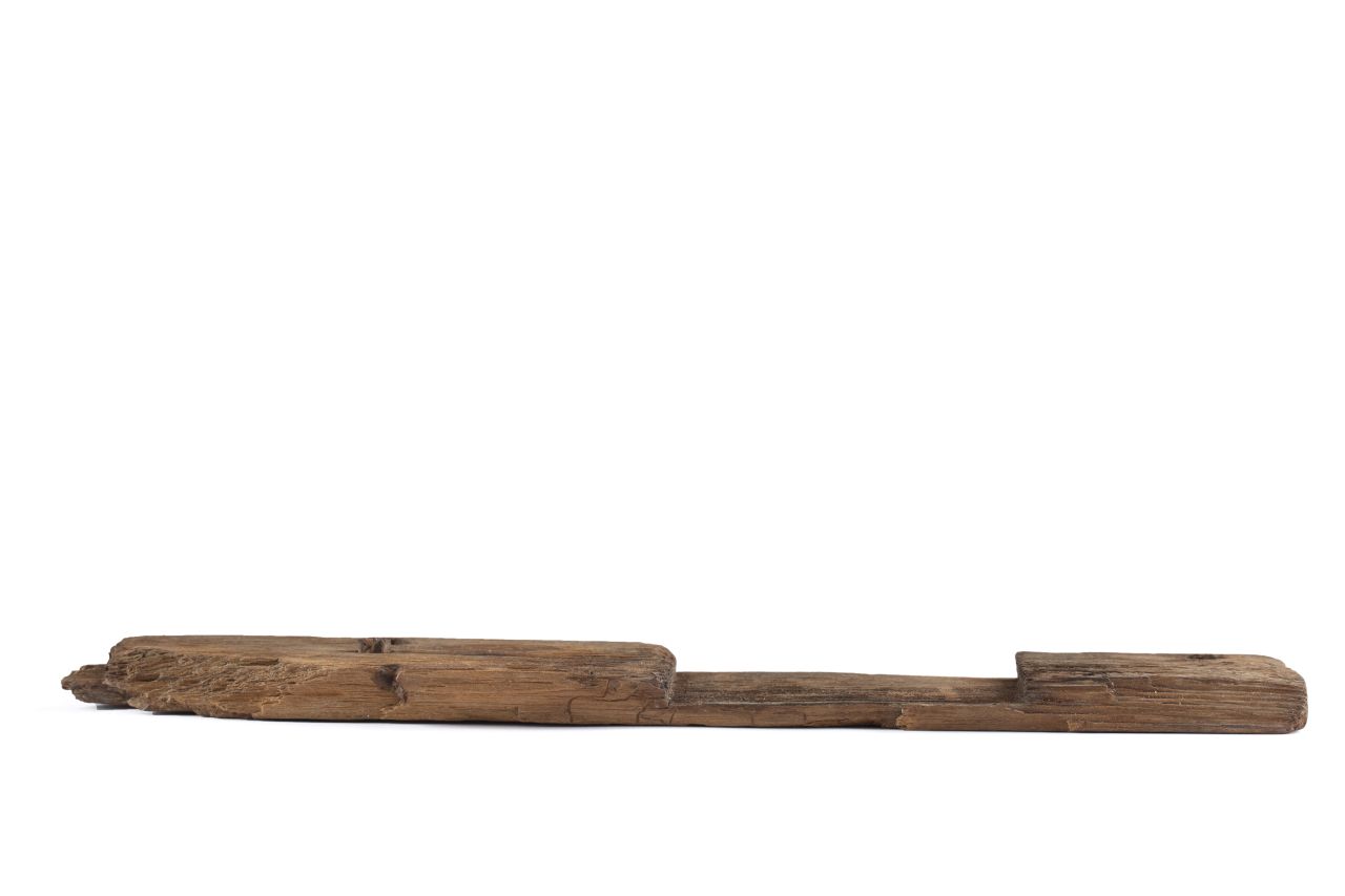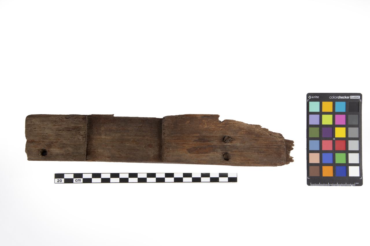 Asse lignea di forma rettangolare; incerta interpretazione. Il reperto presso un lato corto ha il bordo con taglio a 90°, l’altra estremità è fratturata. Presso quest’ultima però si intercetta il laterale dell’incavo che invece è ben conservato e di forma grossomodo quadrata nella parte opposta dell’asse. Sulla faccia principale, nella parte superiore si nota un foro circolare presso l’estremità integra, sede di cavicchio forse realizzato con il cesello o con il trapano a mano; quasi al centro due cavicchi passanti sul retro, paralleli e ravvicinati. Sull’altra faccia, oltre i due cavicchi si nota una superficie liscia e ben levigata. Le lavorazioni riscontrate sul reperto sono levigatura, piallatura, scalpellatura, trapano a mano, sega. La specie arborea, per analogia visiva è l’abete bianco (Abies alba)