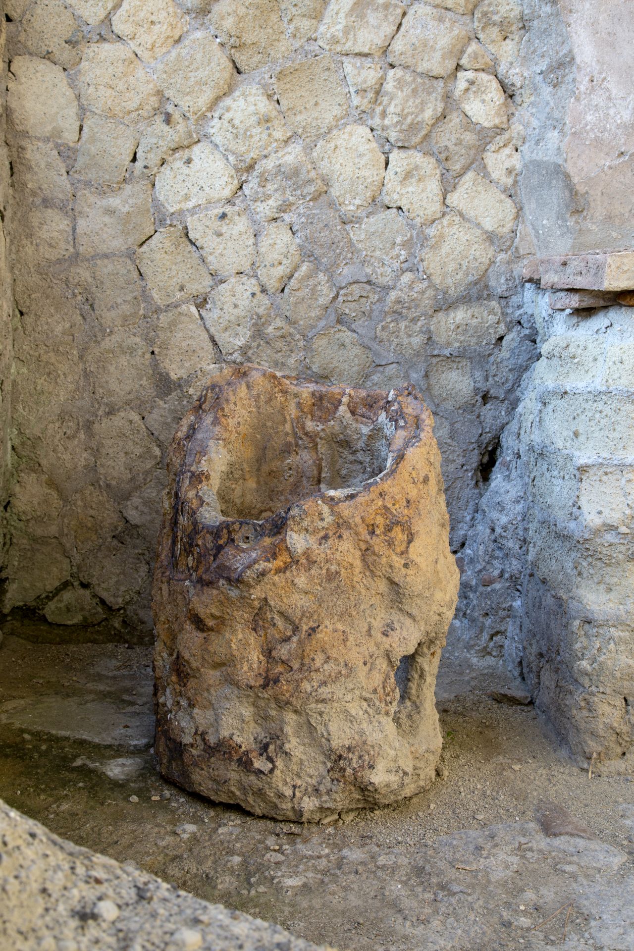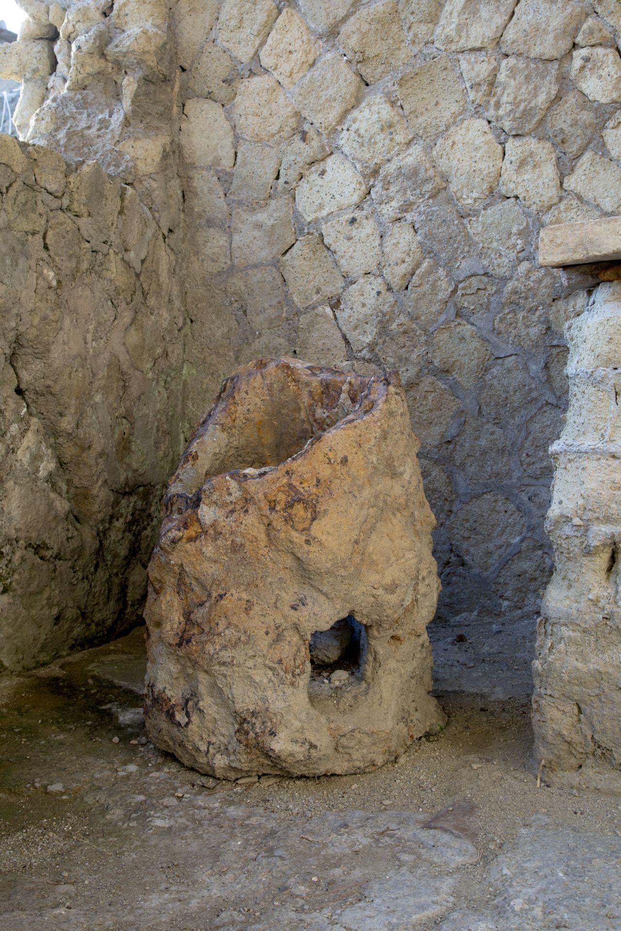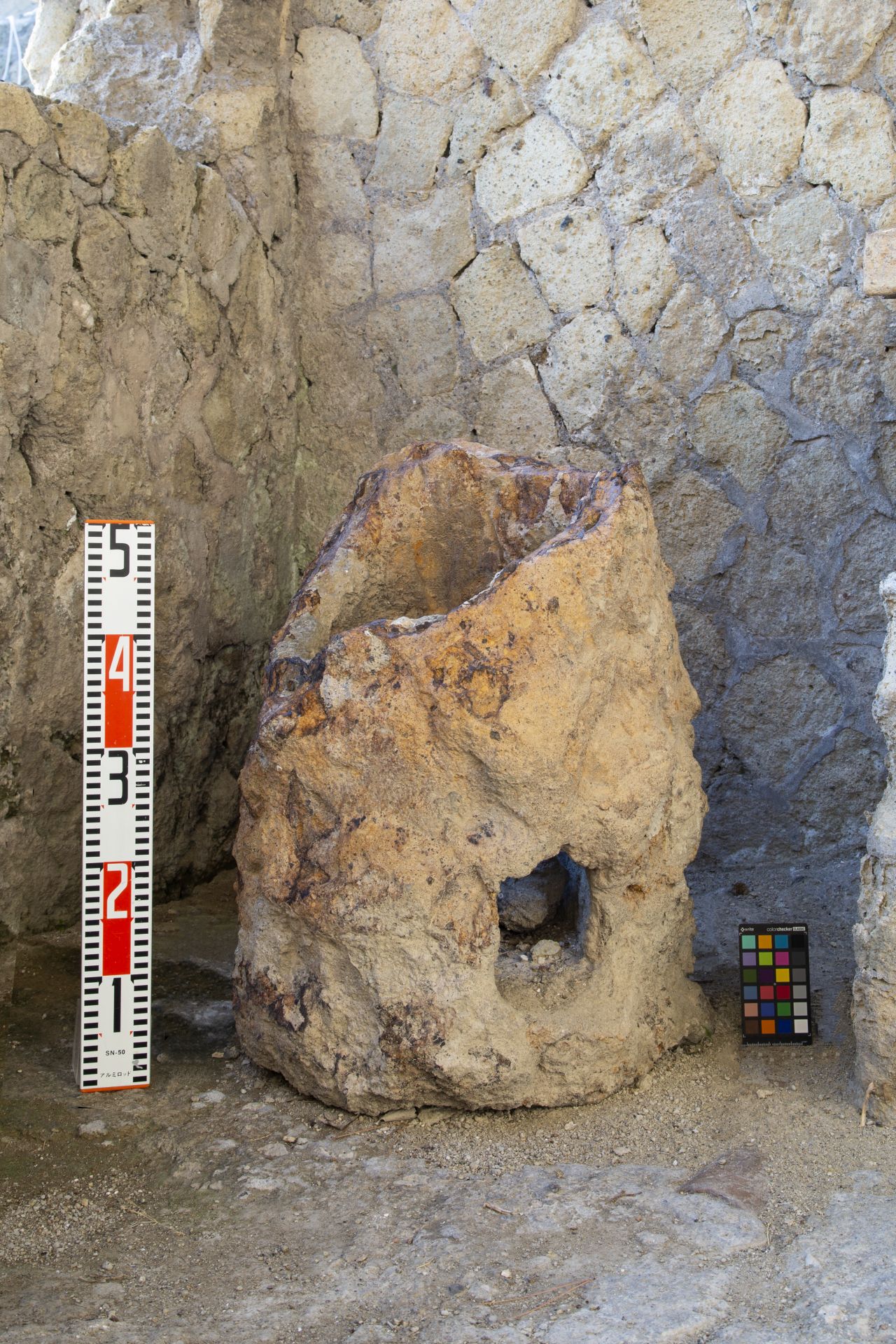 - NOTIZIE STORICO CRITICHE L’oggetto plausibilmente identificabile con una stufa, o uno scaldavivande, forse murato, ad uso domestico. Il foro sulle pareti poteva, in origine essere dotato di uno sportellino e servire per l’immissione del legname. La parte superiore, ora assente poteva essere chiusa da un coperchio e contenere una caldaia da riscaldare. Il reperto è adesso in uno degli ambienti di servizio, la cucina della Casa della Gemma (Ins. Or. I, 1), dato che potrebbe comprovare un uso come scalda vivande. Oggetti simili sono stati ritrovati a Pompei (cfr. Aa. Vv 1996, p. 232, n. 238), anche se in questo caso si tratta di oggetti mobili, con piedini e maniglie per agevolare il trasporto