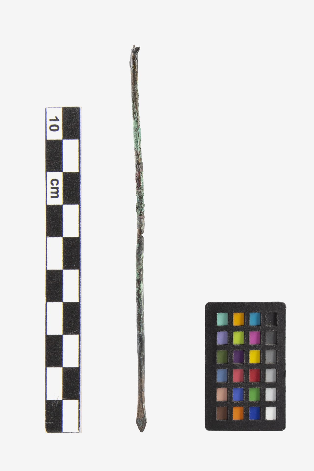 - NOTIZIE STORICO CRITICHE Il reperto potrebbe essere un ago, manca però la cruna. L’acus nel mondo romano è utilizzato per cucire tessuti e bende mediche. Aghi da sutura, frequenti in tutte le epoche, potevano avere anche punte curve o come nel nostro caso l’estremità a “lancia”, come racconta lo storico medievale Andrea Della Croce parlando degli strumenti medici del Medioevo (Tabanelli M. 1958, p. 98)