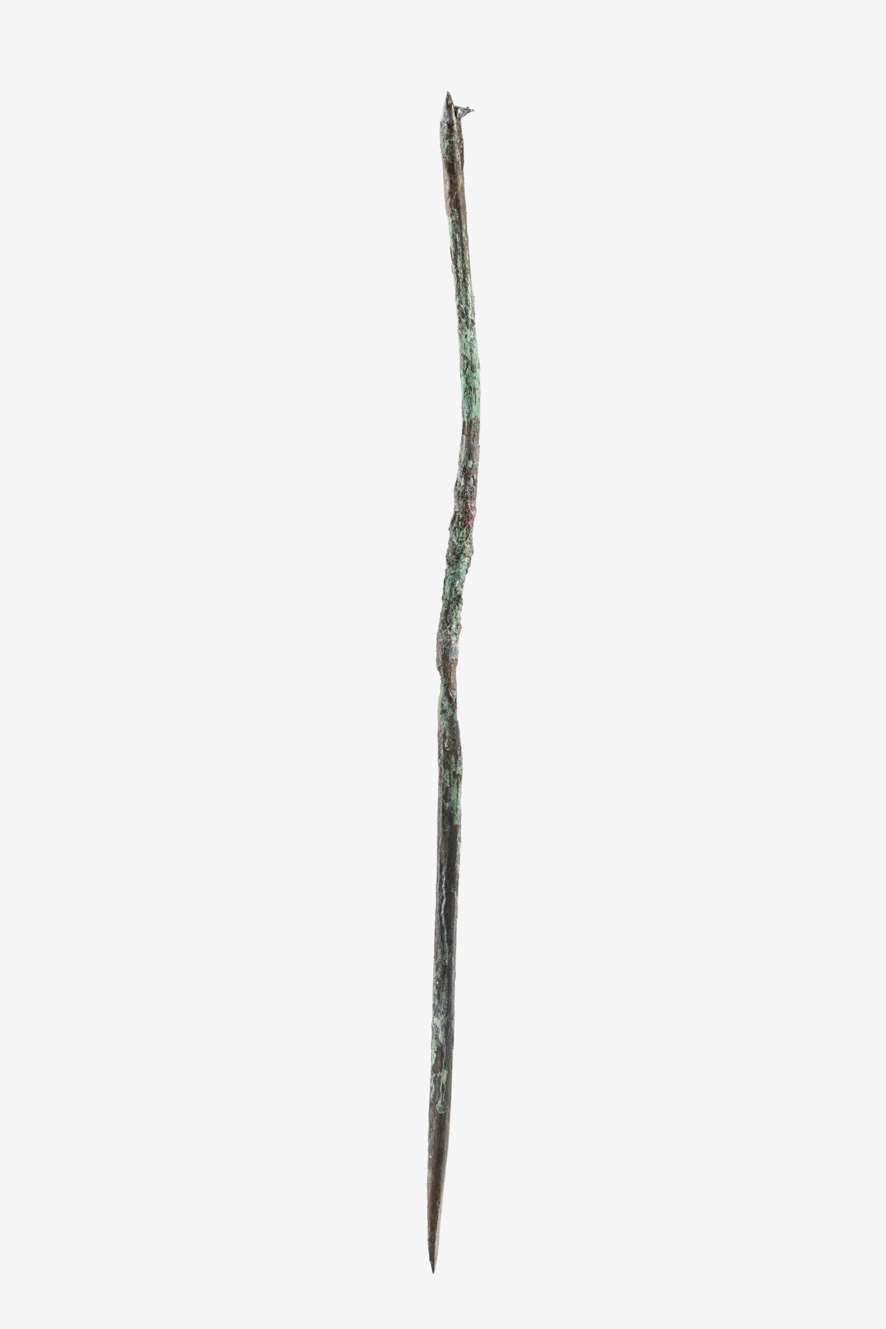 Frammento in bronzo di forma filiforme. Stelo aghiforme. Una delle due estremità è fratturata, l’altra si allarga e appiattisce in una punta di forma triangolare, appuntita