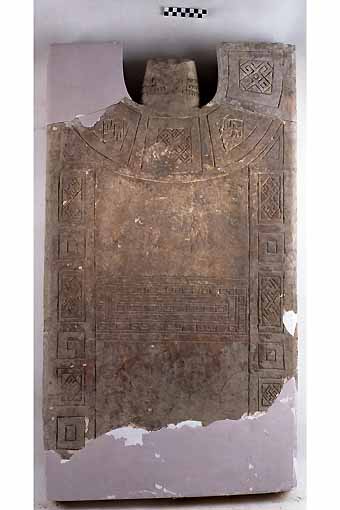 stele con ornamenti, a spalle rialzate, priva della spalla sinistra, spezzata nella parte inferiore