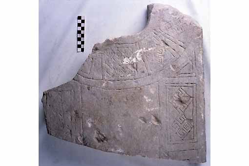 lastra pertinente a parte superiore di stele con ornamenti a spalle rialzate, spezzata all'altezza della cintura, priva del collo e della spalla sinistra