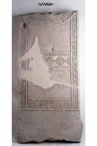 lastra rettangolare pertinente a stele con ornamenti, conservante l'attacco del collo