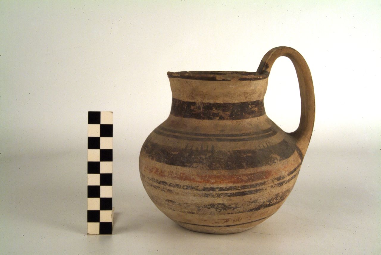 Base piana; corpo globulare; collo concavo; orlo arrotondato; ansa a nastro, verticale, sormontante