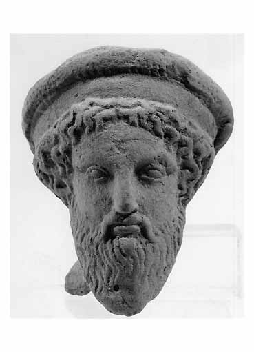 testa e busto di figura maschile; volto ovale, arcate sopraccigliari abbassate, palpebre bordate, naso diritto, barba e baffi a spiovente; sul capo, cercine assicurato sulla fronte da una benda, capelli disposti intorno al viso in lunghe ciocche; busto in torsione sul lato sinistro con spalla coperta da himation; retro chiuso da uno strato di argilla