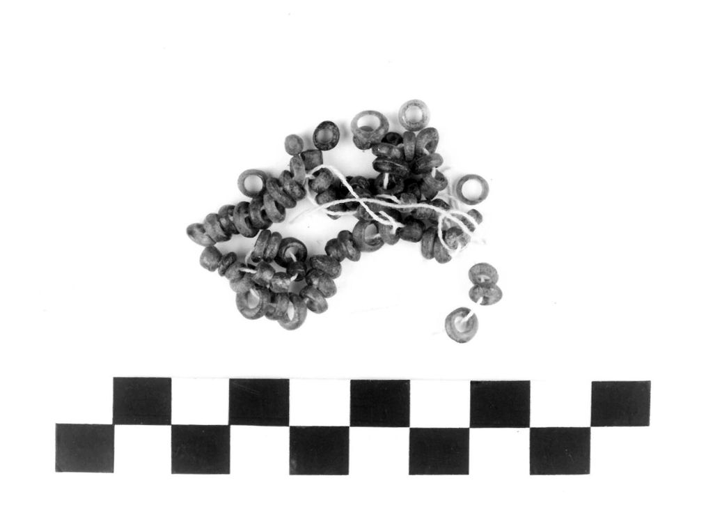 collana composta da 67 vaghi di dimensioni differenti, di forma globulare, cilindrica e biconica, con foro passante. Realizzata in pasta vitrea di colore blu