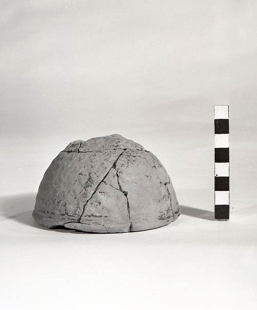sul fondo tre valve rilevate; vasca emisferica decorata a rilievo da sei file di angoli; orlo distinto, scanalato al taglio, con orlo piatto. Verniciata in nero grigiastro