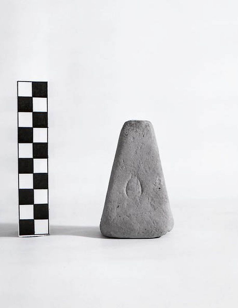 forma troncopiramidale a base quadrata; foro passante; su un lato, bollo