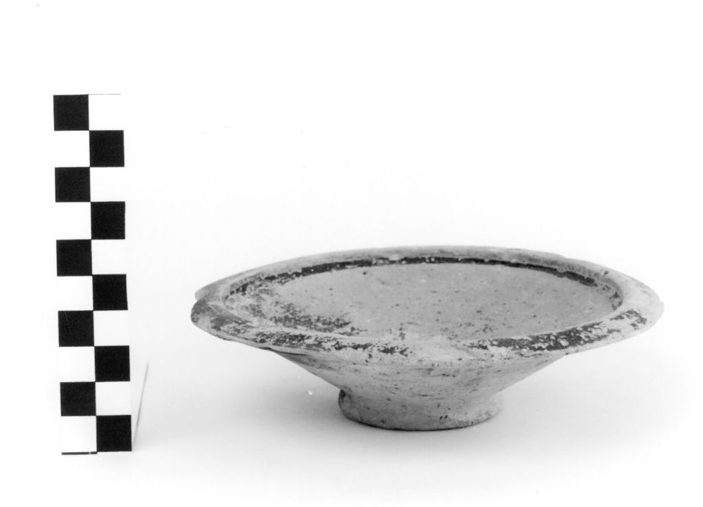 piede troncoconico, cavo all'interno; vasca tesa; orlo estroflesso. A risparmio dalla vernice grigiastra, il fondo del piede