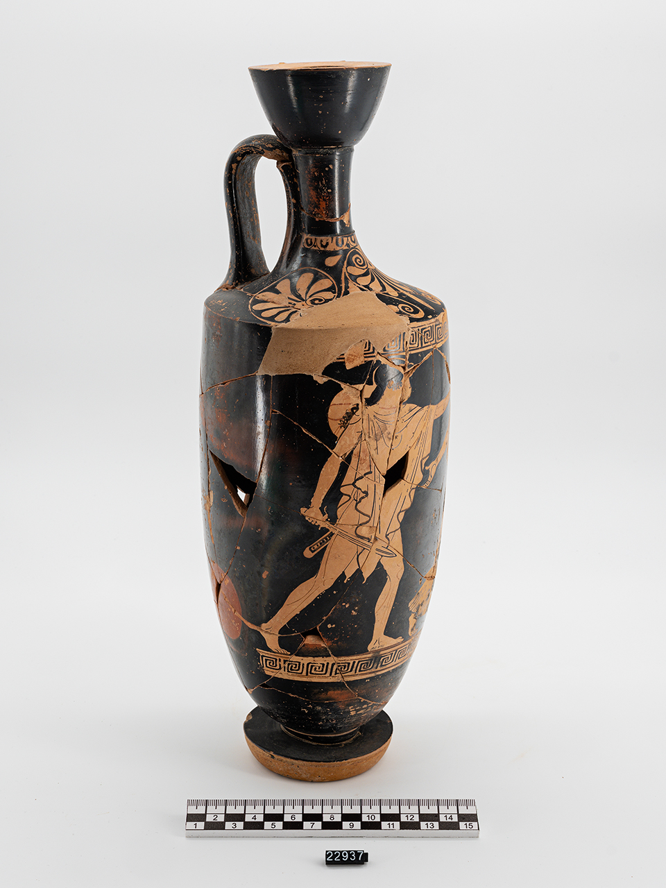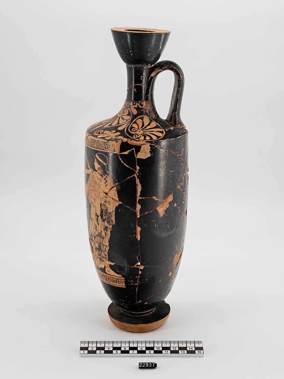 Lekythos con bocchello campanulato, collo cilindrico che sfuma nella spalla distinta, corpo cilindrico con fondo convesso, piede a disco, ansa verticale tra collo e spalla