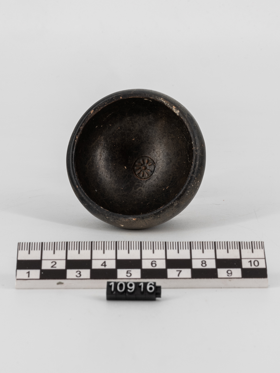 Coppetta/ patera. Piede con pareti concave, corpo rigonfio, orlo arrotondato e rientrante. Vernice nera a risparmio all'interno del piede. Decorazione impressa a stampiglia. Argilla rosa fine, compatta