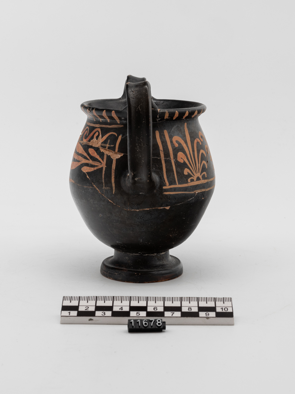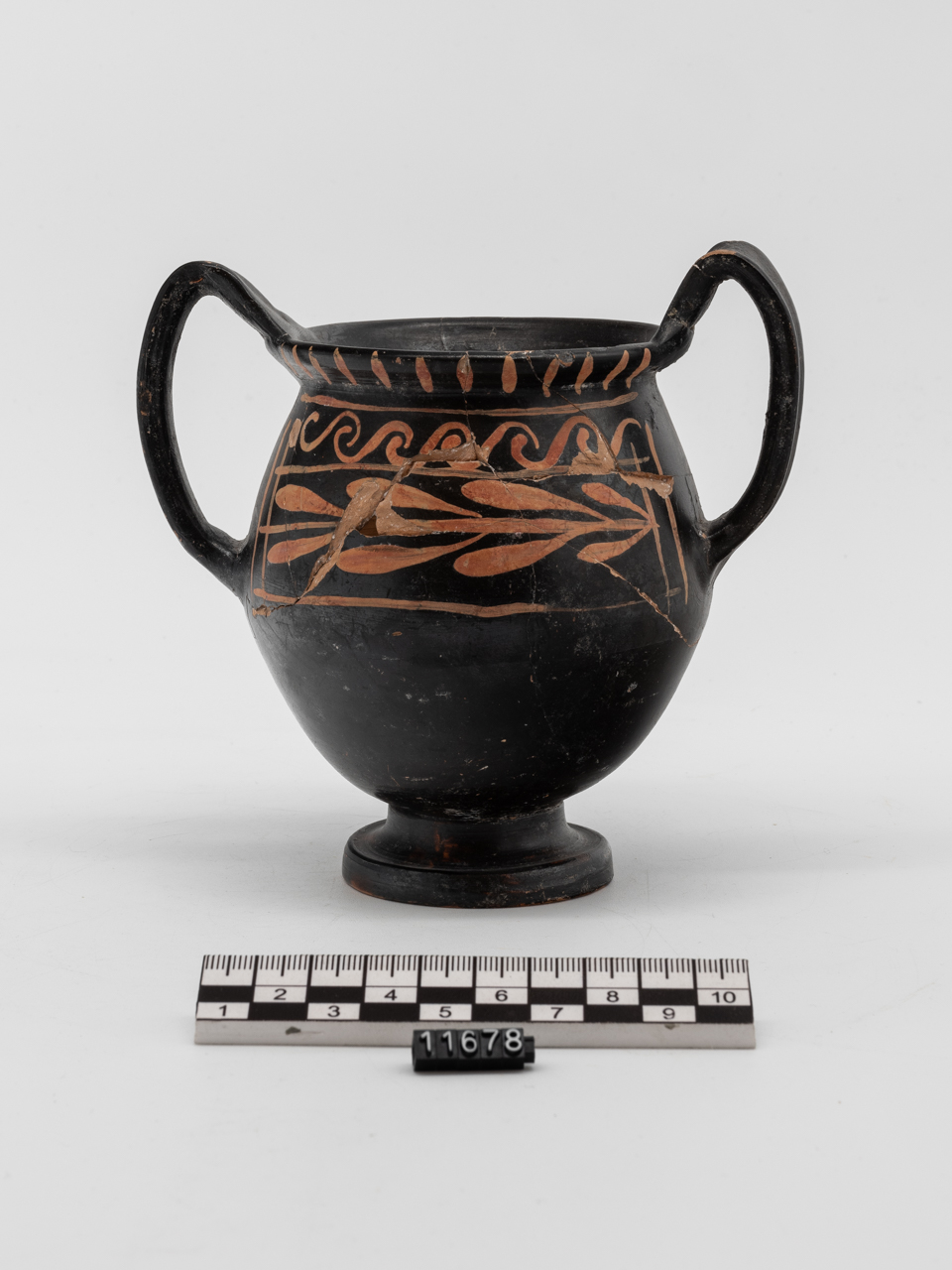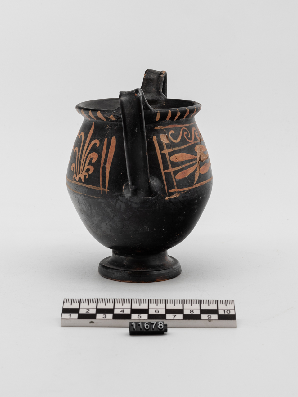 Kantharos in argilla rosata fine, compatta, ben depurata. Piede a fusto concavo su base cilindrica; corpo ovoide, orlo svasato, anse a nastro insellato. Vernice nera lucente. Decorazione sovradipinta rosa