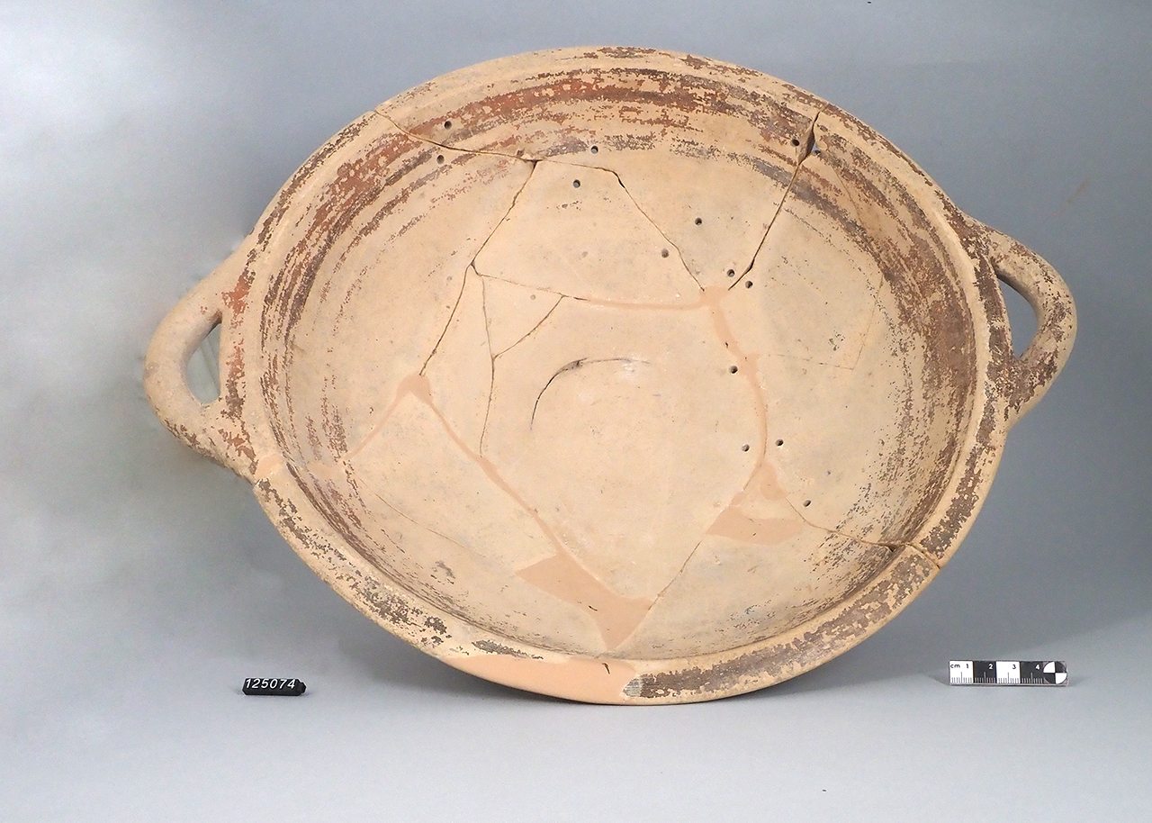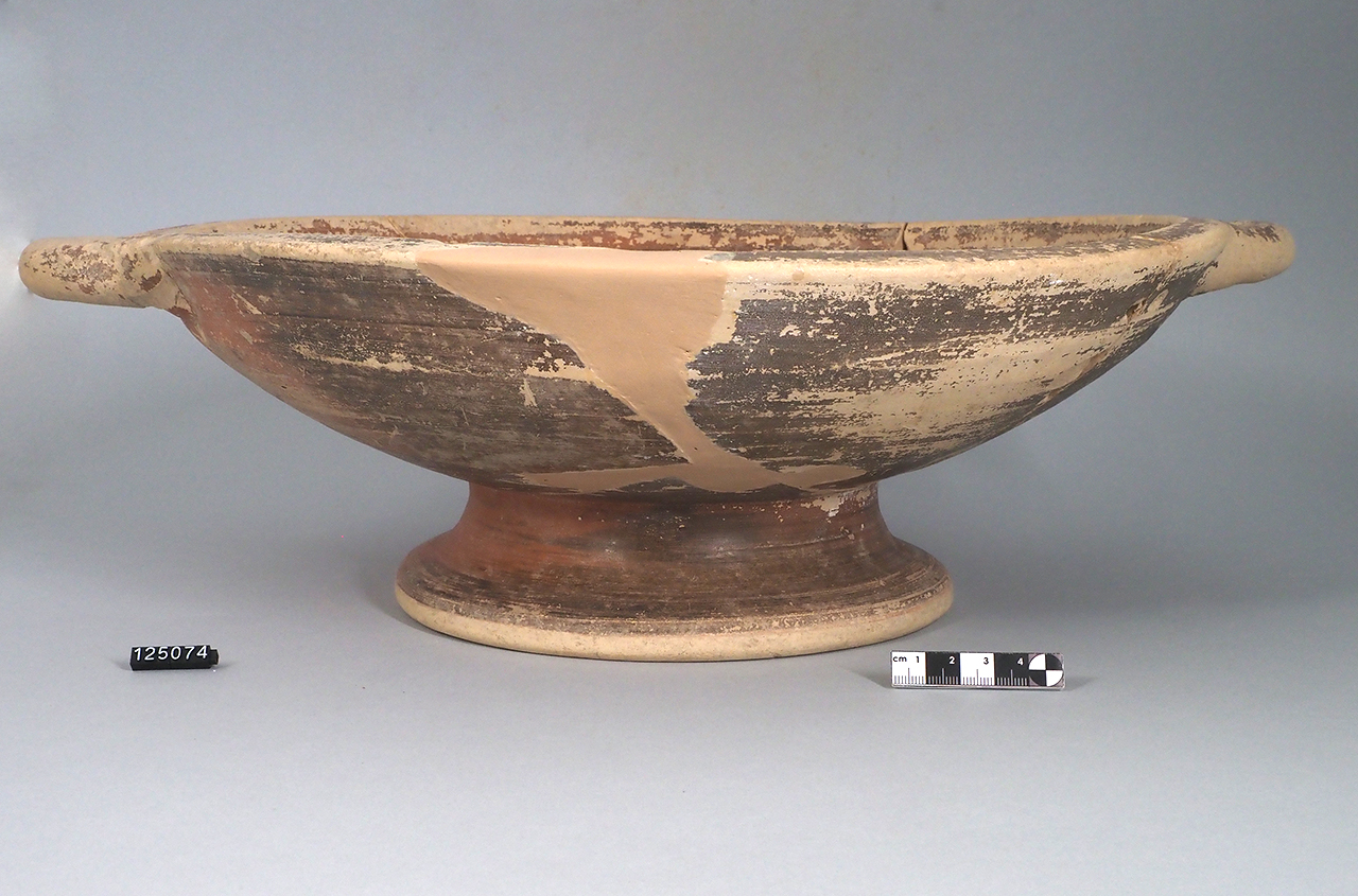 scodella biansata su alto piede: orlo arrotondato, coppa emisferica, piede troncoconico a profilo convesso, coppia di anse a bastoncello orizzontali impostate sull'orlo; corpo e piede verniciati in bruno-rossastro, risparmiato il sostegno; presenti dieci coppie di fori per grappe