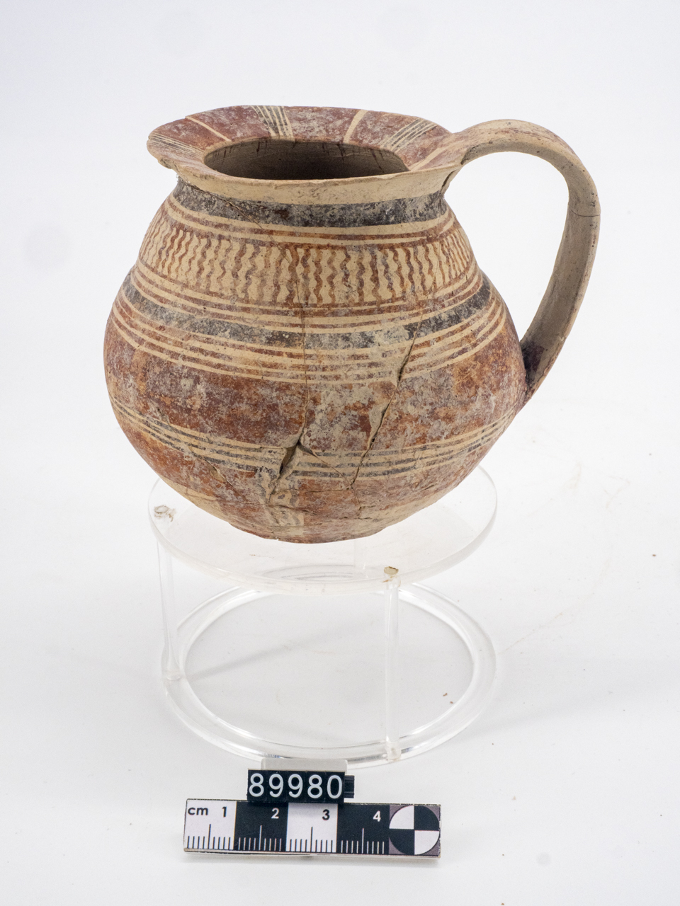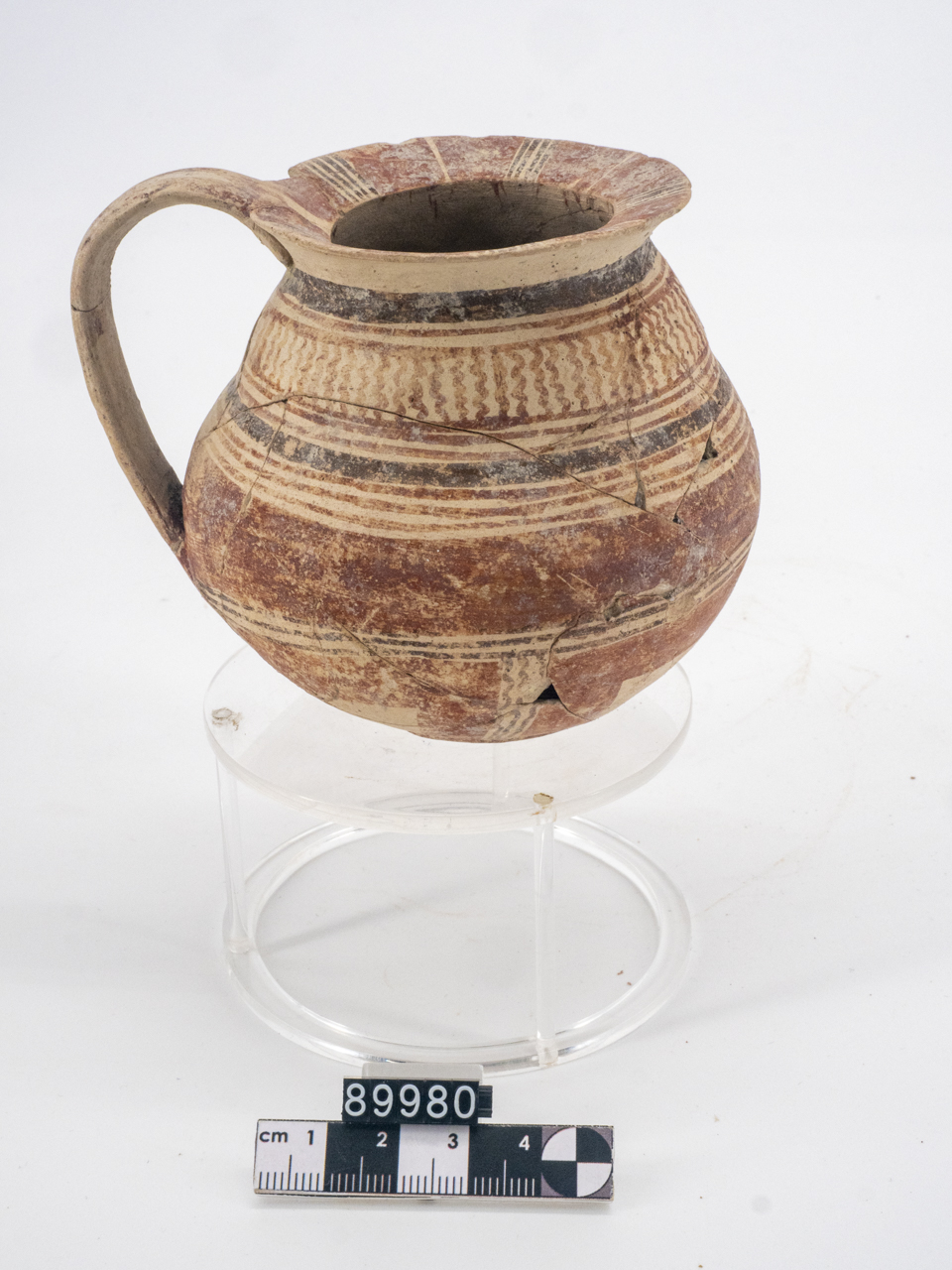 Fondo piatto, corpo ovoide, orlo estroflesso, ansa verticale a nastro