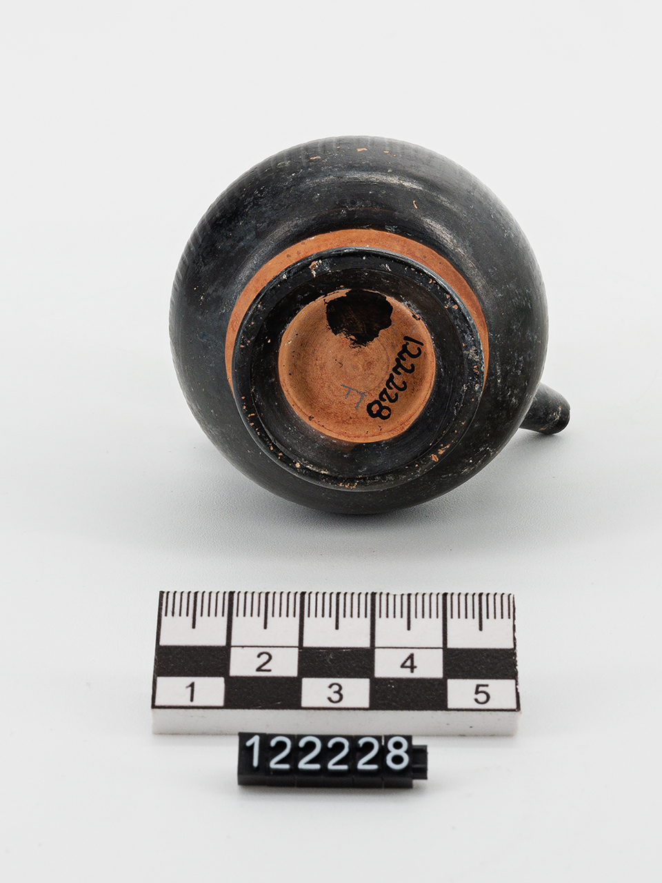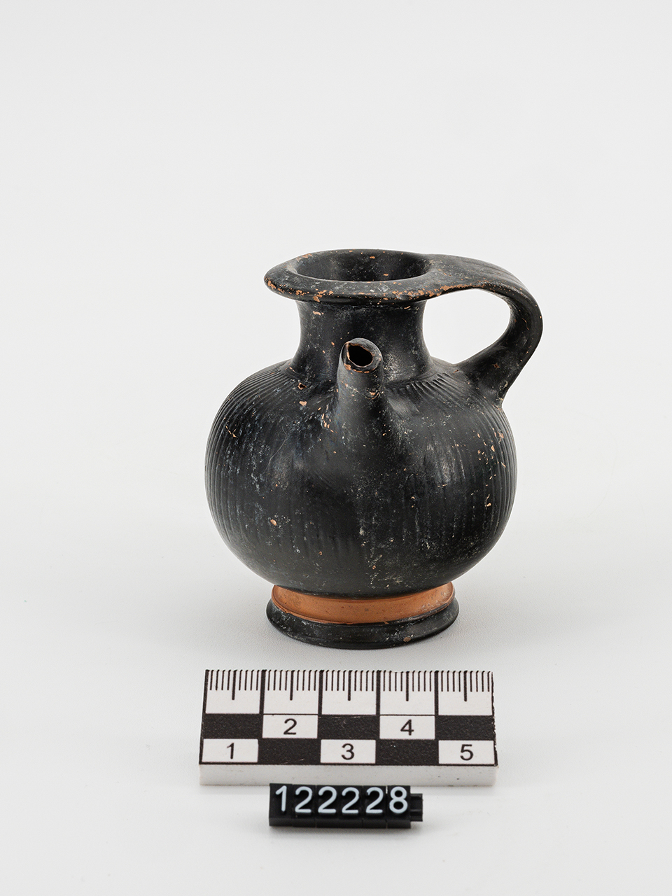 orlo estroflesso, collo a profilo concavo, corpo globulare strigilato, piede ad anello, beccuccio troncoconico impostato obliquamente sulla spalla, ansa a nastro verticale impostata sull'orlo e sulla spalla, vernice nera in parte risparmiata