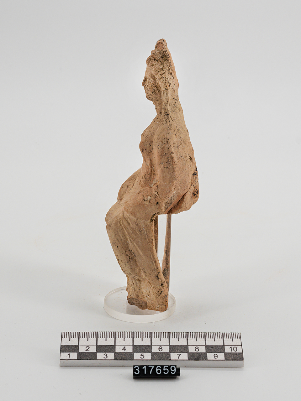 Figura femminile seduta, ammantata, con capelli spartiti e alta crocchia, adorna di orecchini, braccio sinistro aderente alla gamba e braccio destro ripiegato sul grembo
