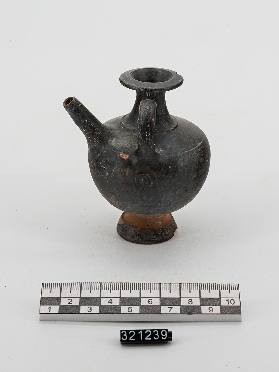 labbro a tesa orizzontale, collo convesso, corpo globulare, piede troncoconico con gola d'attacco, ansa a bastoncello verticale, beccuccio impostato obliquamente sulla spalla; vernice nera risparmiata all'attacco del piede
