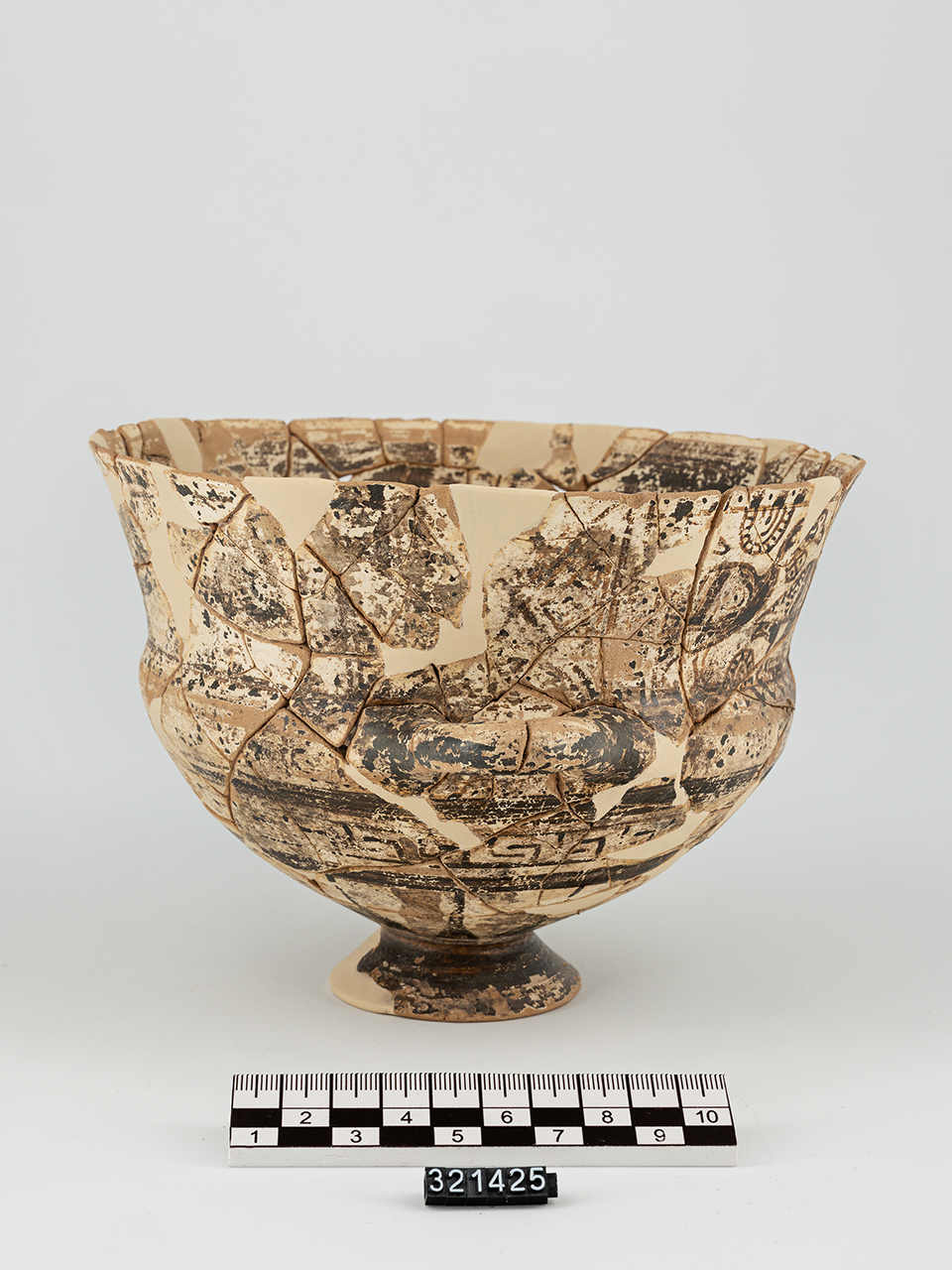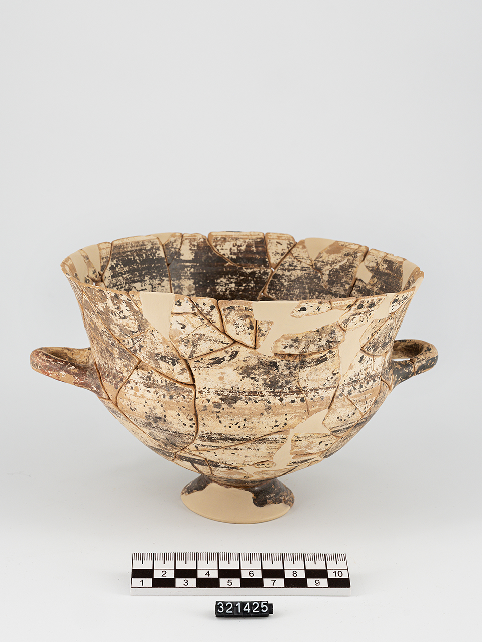 Kylix (calice) ad alto orlo estroflesso, vasca globulare rastremata in basso, piede troncoconico, anse a bastoncello oblique sul corpo