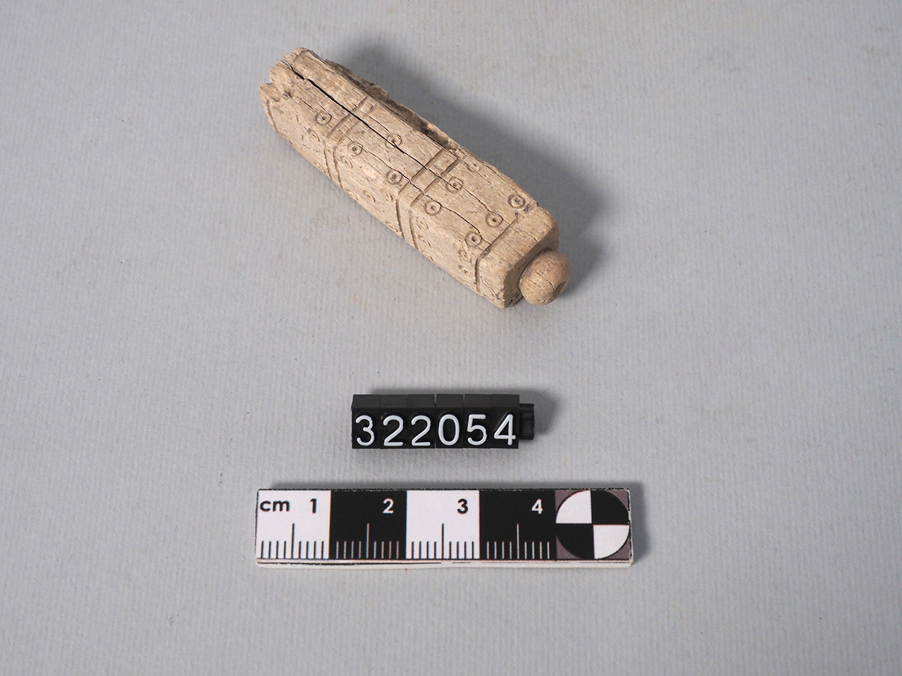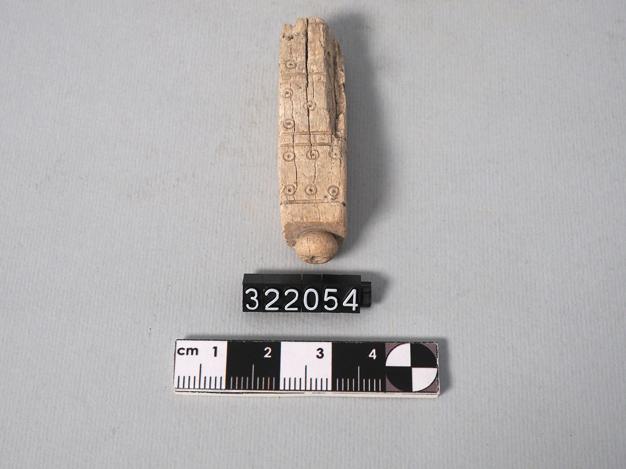 Spillone a sezione quadrangolare, con facce recanti una decorazione incisa con sei, cinque e quattro cerchietti inscritti e separati, superiormente ed inferiormente, da linea profondamente incisa; terminazione a pomello globulare schiacciato