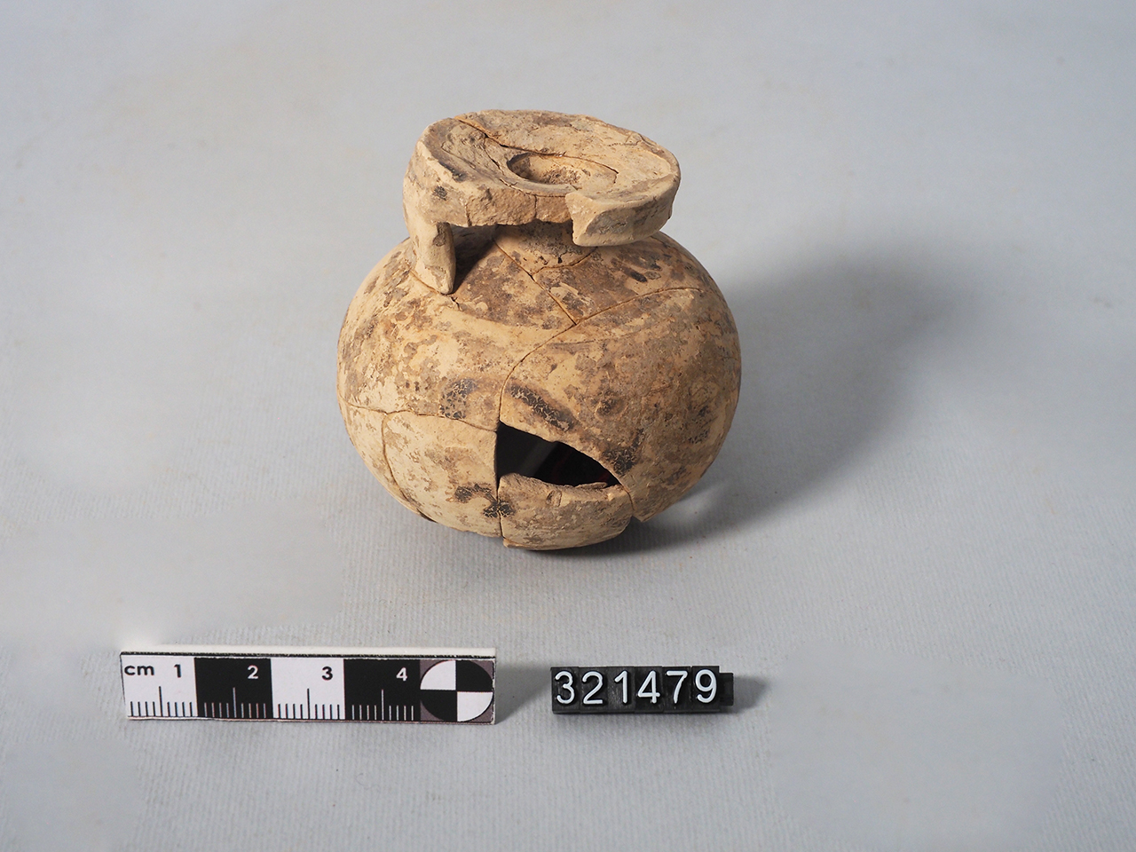 labbro discoidale con orlo revoluto, collo cilindrico, corpo globulare schiacciato, ansa a nastro verticale; decorazione fitomorfa