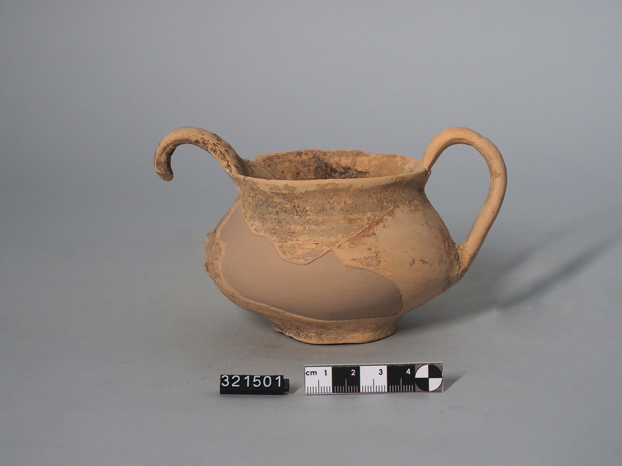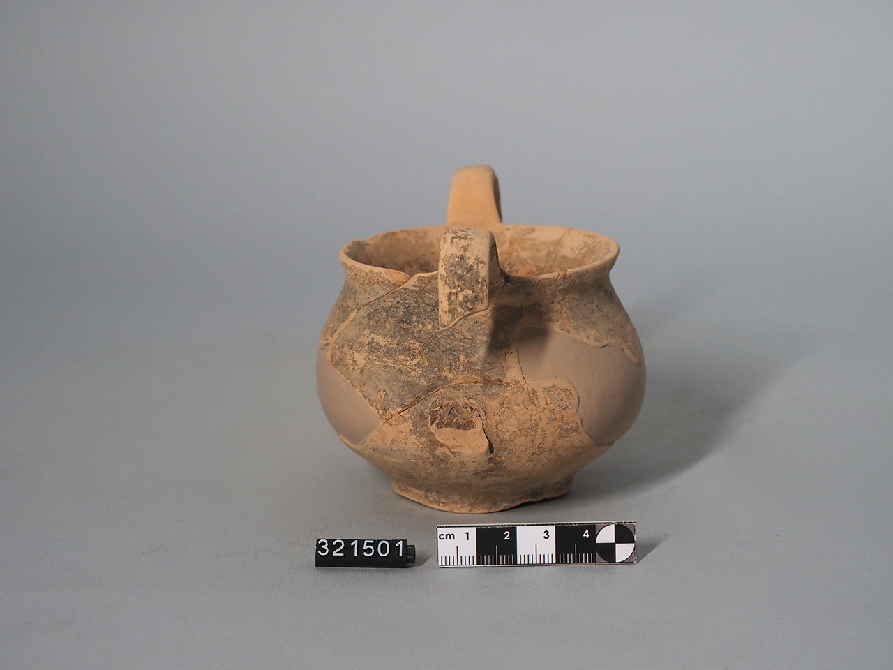 orlo obliquo, corpo globulare, piede a disco, anse verticali a nastro; decorazione a motivi geometrici in vernice ocra e bruna