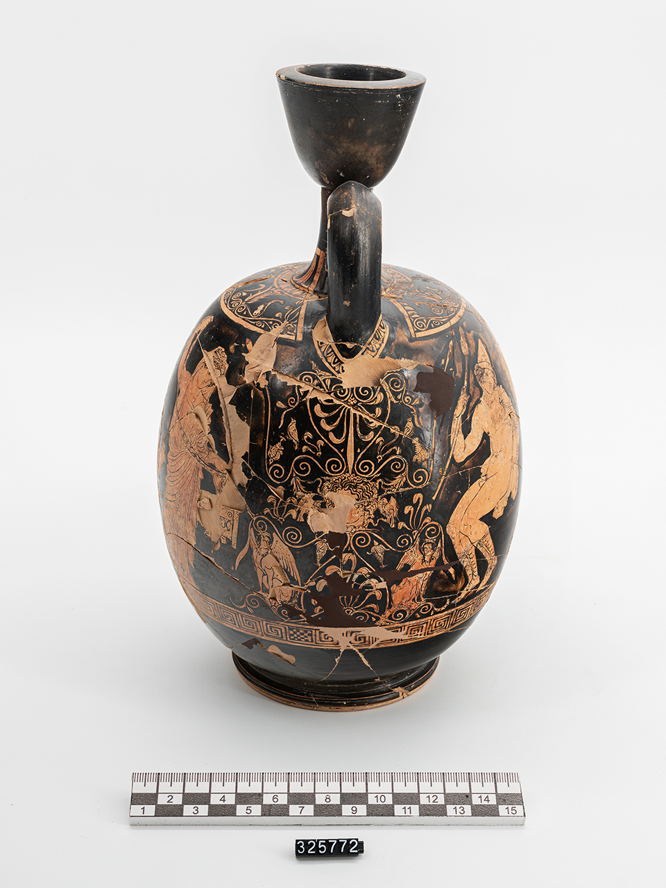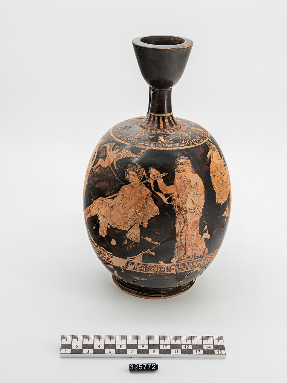 Lekythos con alto bocchello campanulato a orlo piatto, collo concavo, corpo ovoidale rigonfio, piede ad anello modanato, ansa a bastoncello verticale tra collo e spalla