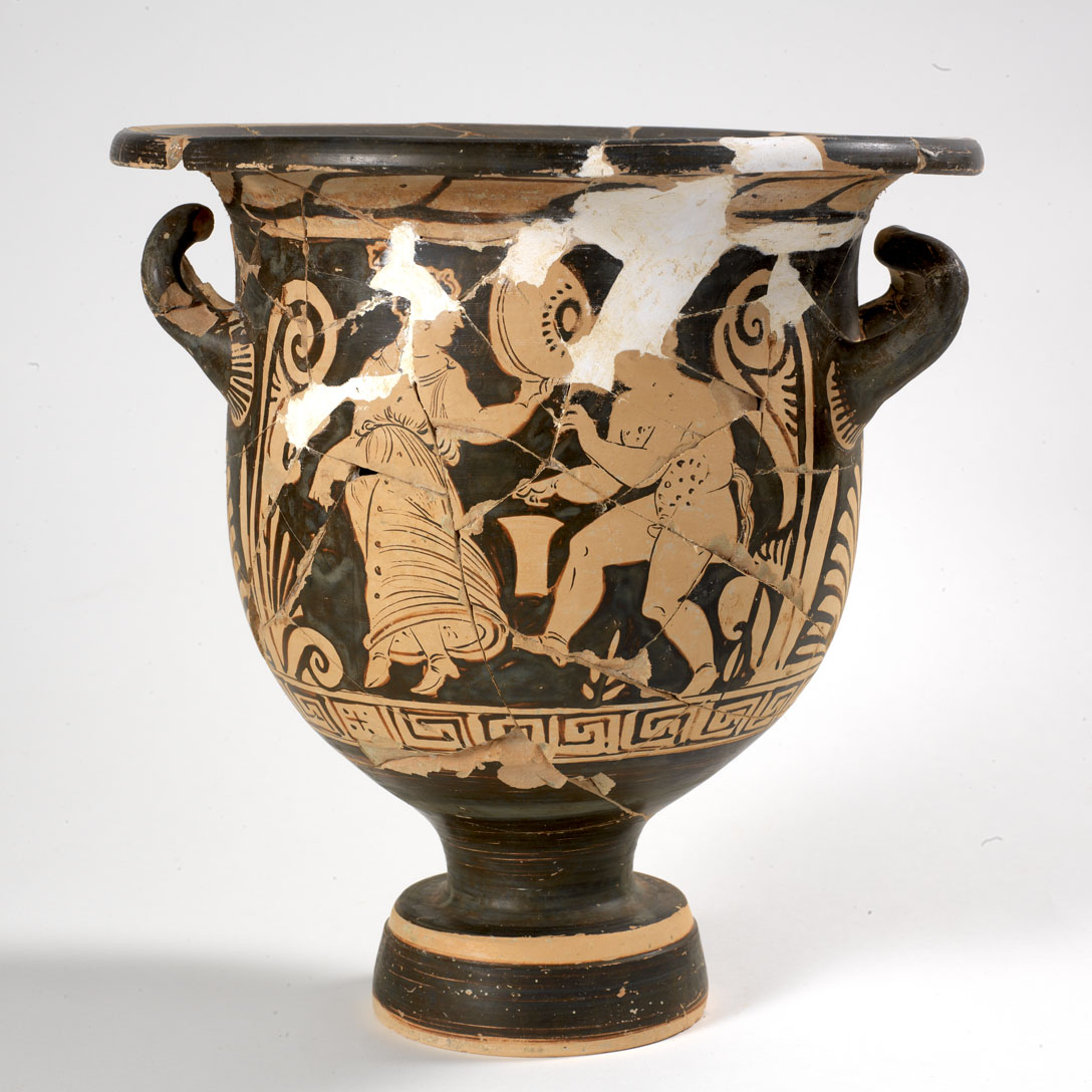 Cratere a campana in argilla camoscio-rosata, vernice nera lucida, non particolarmente compatta. Alto piede a echino con risega presso la fascia superiore, corpo campaniforme che termina in un labbro estroflesso distinto con orlo pendente. Anse a bastoncello, impostate orizzontalmente sul corpo, ritorte verso l’alto. Il labbro e la vasca sono decorati secondo la tecnica a figure rosse