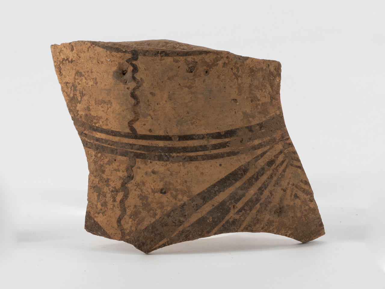 Frammento di ceramica con decorazione subgomentrica. Un riquadro a costituito da 3 bande orizzontali racchiude la decorazione a motivo a tenda. Sono presenti linee ondulate verticali