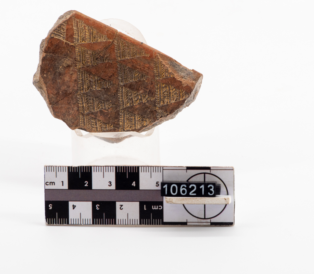 Frammento di parete di ciotola in impasto beige-arancio; decorazione a triangoli campiti mediante l'utilizzo di pintaderas all'interno e all'esterno