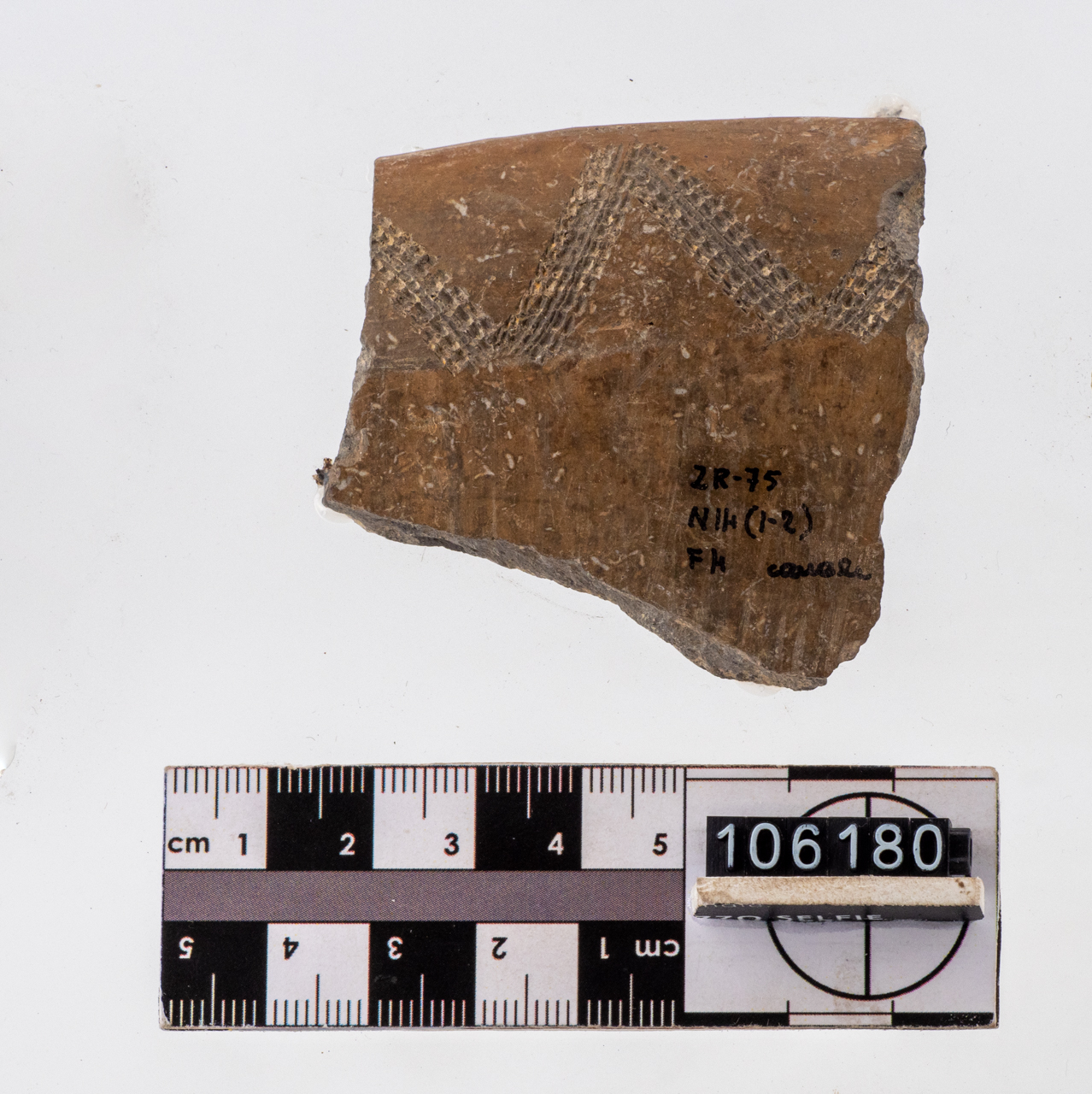Frammento di ciotola d'impasto bruno grigiastro; decorazione con motivi incisi sotto l'orlo a triangoli incisi