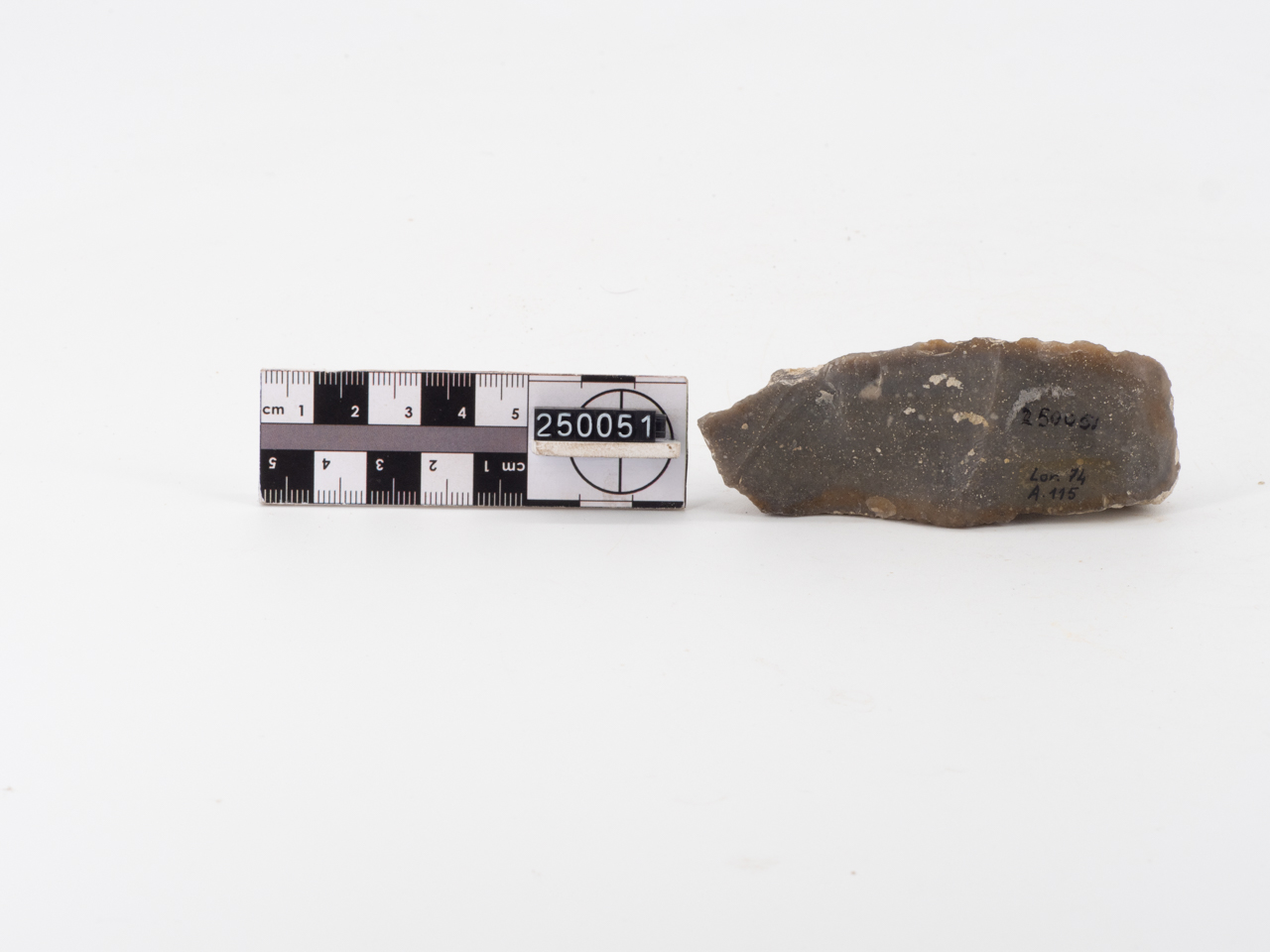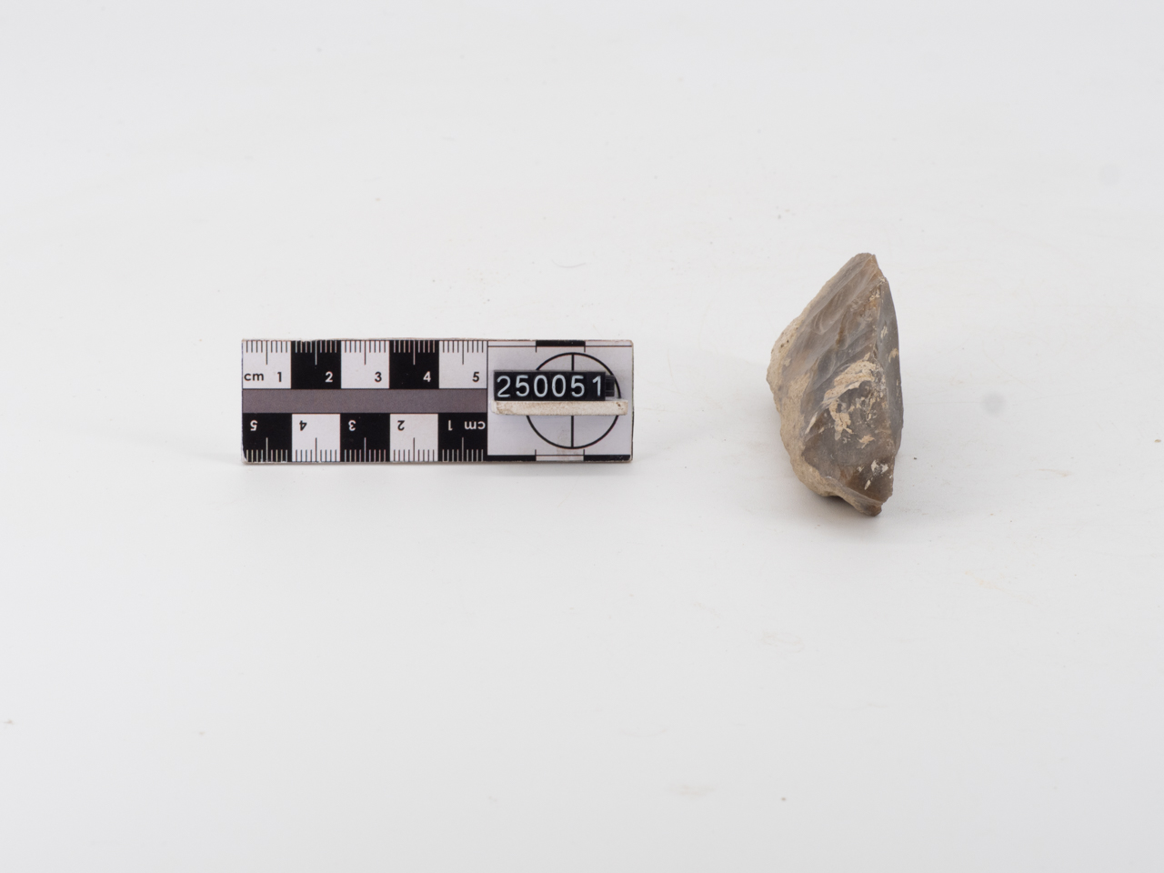 Industria su scheggia. Punta carenoide, a sezione triangolare, con ritocco laterale. Selce bruna corticata